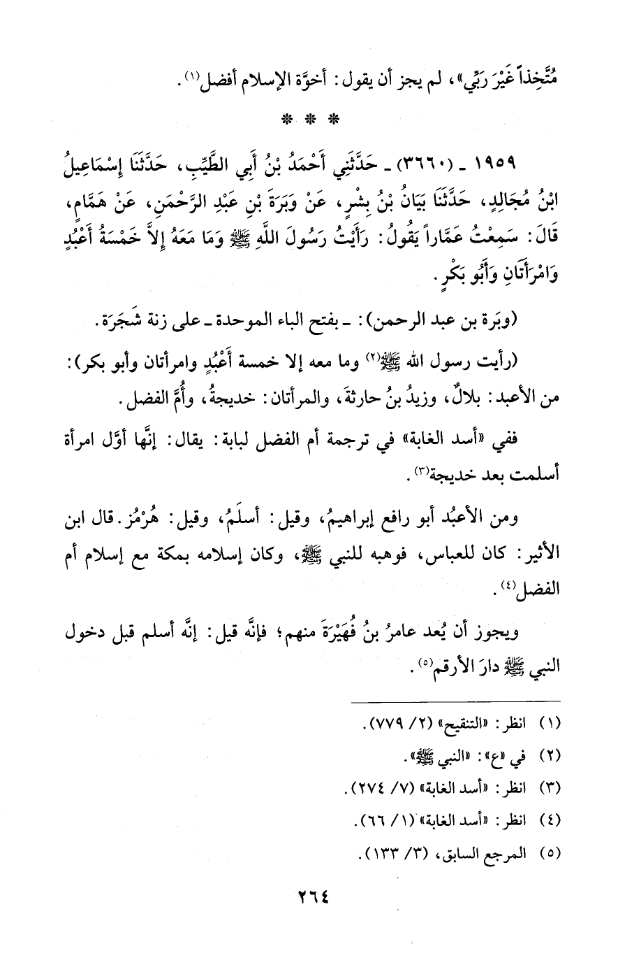 1959 - (3660) - حَدَّثَنِي أَحْمَدُ بْنُ أَبِي الطَّيِّبِ، حَدَّثَنَا إِسْمَاعِيلُ ابْنُ مُجَالِدٍ، حَدَّثَنَا بَيَانُ بْنُ بِشْرٍ، عَنْ وَبَرَةَ بْنِ عَبْدِ الرَّحْمَنِ، عَنْ هَمَّامٍ، قَالَ: سَمِعْتُ عَمَّارًا يَقُولُ: رَأَيْتُ رَسُولَ اللَّهِ - صلى الله عليه وسلم - وَمَا مَعَهُ إِلَّا خَمْسَةُ أَعْبُدٍ وَامْرَأَتَانِ وَأَبُو بَكْرٍ.