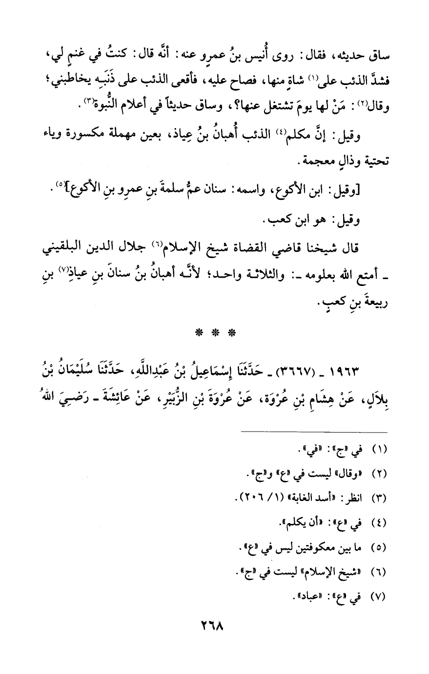 ساق حديثه، فقال: روى أُنيس بنُ عمرٍو عنه: أنَّه قال: كنتُ في غنمٍ لي، فشدَّ الذئب على (¬1) شاة منها، فصاح عليه، فأقعى الذئب على ذَنَبِه يخاطبني؛ وقال (¬2): مَنْ لها يومَ تشتغل عنها؟، وساق حديثًا في أعلام النُّبوة (¬3).
