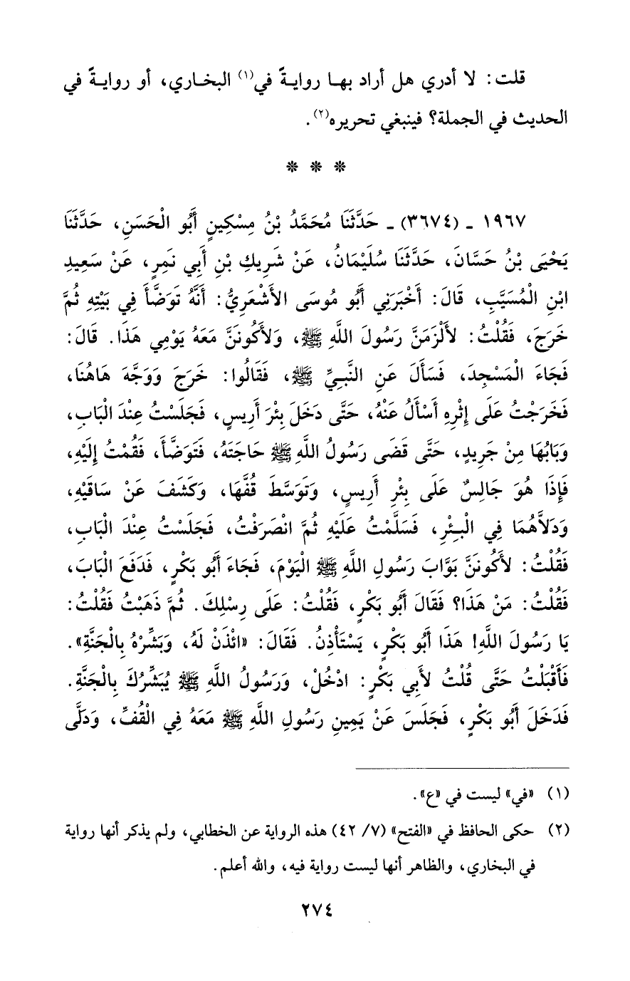 1967 - (3674) - حَدَّثَنَا مُحَمَّدُ بْنُ مِسْكِينٍ أَبُو الْحَسَنِ، حَدَّثَنَا يَحْيَى بْنُ حَسَّانَ، حَدَّثَنَا سُلَيْمَانُ، عَنْ شَرِيكِ بْنِ أَبِي نَمِرٍ، عَنْ سَعِيدِ ابْنِ الْمُسَيَّبِ، قَالَ: أَخْبَرَنِي أَبُو مُوسَى الأَشْعَرِيُّ: أَنَّهُ تَوَضَّأَ فِي بَيْتِهِ ثُمَّ خَرَجَ، فَقُلْتُ: لأَلْزَمَنَّ رَسُولَ اللَّهِ - صلى الله عليه وسلم -، وَلأَكُونَنَّ مَعَهُ يَوْمِي هَذَا. قَالَ: فَجَاءَ الْمَسْجِدَ، فَسَأَلَ عَنِ النَّبِيِّ - صلى الله عليه وسلم -، فَقَالُوا: خَرَجَ وَوَجَّهَ هَاهُنَا، فَخَرَجْتُ عَلَى إِثْرِهِ أَسْأَلُ عَنْهُ، حَتَّى دَخَلَ بِئْرَ أَرِيسٍ، فَجَلَسْتُ عِنْدَ الْبَابِ، وَبَابُهَا مِن جَرِيدٍ، حَتَّى قَضَى رَسُولُ اللَّهِ - صلى الله عليه وسلم - حَاجَتَهُ، فَتَوَضَّأَ، فَقُمْتُ إِلَيْهِ، فَإِذَا هُوَ جَالِسٌ عَلَى بِئْرِ أَرِيسٍ، وَتَوَسَّطَ قُفَّهَا، وَكَشَفَ عَنْ سَاقَيْهِ، وَدَلَّاهُمَا فِي الْبِئْرِ، فَسَلَّمْتُ عَلَيْهِ ثُمَّ انْصَرَفْتُ، فَجَلَسْتُ عِنْدَ الْبَابِ، فَقُلْتُ: لأَكُونَنَّ بَوَّابَ رَسُولِ اللَّهِ - صلى الله عليه وسلم - الْيَوْمَ، فَجَاءَ أَبُو بَكْرٍ، فَدَفَعَ الْبَابَ، فَقُلْتُ: مَنْ هَذَا؟ فَقَالَ أَبُو بَكْرٍ، فَقُلْتُ: عَلَى رِسْلِكَ. ثُمَّ ذَهَبْتُ فَقُلْتُ: يَا رَسُولَ اللَّهِ! هَذَا أَبُو بَكْرٍ، يَسْتَأْذِنُ. فَقَالَ: "ائْذَنْ لَهُ، وَبَشِّرْهُ بِالْجَنَّةِ". فَأَقْبَلْتُ حَتَى قُلْتُ لأَبِي بَكْرٍ: ادْخُلْ، وَرَسُولُ اللَّهِ - صلى الله عليه وسلم - يُبَشَّرُكَ بِالْجَنَّةِ. فَدَخَلَ أَبُو بَكْرٍ، فَجَلَسَ عَنْ يَمِينِ رَسُولِ اللَّهِ - صلى الله عليه وسلم - مَعَهُ فِي الْقُفِّ، وَدَلَّى