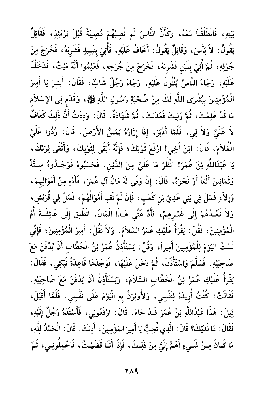 بَيْتِهِ، فَانْطَلَقْنَا مَعَهُ، وَكَأَنَّ النَّاسَ لَمْ تُصِبْهُمْ مُصِيبَةٌ قَبْلَ يَوْمَئِذٍ، فَقَائِلٌ يَقُولُ: لَا بَأْسَ، وَقَائِلٌ يَقُولُ: أَخَافُ عَلَيْهِ، فَأُتِيَ بِنَبِيذٍ فَشَرِبَهُ، فَخَرَجَ مِنْ جَوْفِهِ، ثُمَّ أُتُيَ بِلَبَنٍ فَشَرِبَهُ، فَخَرَجَ مِنْ جُرْحِهِ، فَعَلِمُوا أَنَّهُ مَيِّتٌ، فَدَخَلْنَا عَلَيْهِ، وَجَاءَ النَّاسُ يُثْنُونَ عَلَيْهِ، وَجَاءَ رَجُلٌ شَابٌّ، فَقَالَ: أَبْشِرْ يَا أَمِيرَ الْمُؤْمِنِينَ بِبُشْرَى اللَّهِ لَكَ مِنْ صُحْبَةِ رَسُولِ اللَّهِ - صلى الله عليه وسلم -، وَقَدَمٍ فِي الإسْلَامِ مَا قَدْ عَلِمْتَ، ثُمَّ وَلِيتَ فَعَدَلْتَ، ثُمَّ شَهَادَةٌ. قَالَ: وَدِدْتُ أَنَّ ذَلِكَ كفَافٌ لَا عَلَيَّ وَلَا لِي. فَلَمَّا أَدْبَرَ، إِذَا إِزَارُهُ يَمَسُّ الأَرْضَ. قَالَ: رُدُّوا عَلَيَّ الْغُلَامَ، قَالَ: ابْنَ أَخِي! ارْفَعْ ثَوْبَكَ؛ فَإِنَّهُ أَبْقَى لِثَوْبِكَ، وَأَتْقَى لِرَبِّكَ، يَا عَبْدَ اللَّهِ بْنَ عُمَرَ! انْظُرْ مَا عَلَيَّ مِنَ الدَّيْنِ. فَحَسَبُوهُ فَوَجَدُوهُ سِتَّةً وَثَمَانِينَ أَلْفًا أَوْ نَحْوَهُ، قَالَ: إِنْ وَفَى لَهُ مَالُ آلِ عُمَرَ، فَأَدِّهِ مِنْ أَمْوَالِهِمْ، وَإِلَّا، فَسَلْ فِي بَنِي عَدِيِّ بْنِ كعْبٍ، فَإِنْ لَمْ تَفِ أَمْوَالُهُمْ، فَسَلْ فِي قُرَيْشٍ، وَلَا تَعْدُهُمْ إِلَى غَيْرِهِمْ، فَأَدِّ عَنِّي هَذَا الْمَالَ، انْطَلِقْ إِلَى عَائِشَةَ أُمِّ الْمُؤْمِنِينَ، فَقُلْ: يَقْرَأُ عَلَيْكِ عُمَرُ السَّلَامَ. وَلَا تَقُلْ: أَمِيرُ الْمُؤْمِنِينَ؛ فَإِنَّي لَسْتُ الْيَوْمَ لِلْمُؤْمِنِينَ أَمِيرًا، وَقُلْ: يَسْتَأْذِنُ عُمَرُ بْنُ الْخَطَّابِ أَنْ يُدْفَنَ مَعَ صَاحِبَيْهِ. فَسَلَّمَ وَاسْتَأْذَنَ، ثُمَّ دَخَلَ عَلَيْهَا، فَوَجَدَهَا قَاعِدَةً تَبْكِي، فَقَالَ: يَقْرَأُ عَلَيْكِ عُمَرُ بْنُ الْخَطَّابِ السَّلَامَ، وَيَسْتَأْذِنُ أَنْ يُدْفَنَ مَعَ صَاحِبَيْهِ. فَقَالَتْ: كُنْتُ أُرِيدُهُ لِنَفْسِي، وَلأُوثِرَنَّ بِهِ الْيَوْمَ عَلَى نَفْسِي. فَلَمَّا أَقْبَلَ، قِيلَ: هَذَا عَبْدُ اللَّهِ بْنُ عُمَرَ قَدْ جَاءَ. قَالَ: ارْفَعُونِي، فَأَسْنَدَهُ رَجُلٌ إِلَيْهِ، فَقَالَ: مَا لَدَيْكَ؟ قَالَ: الَّذِي تُحِبُّ يَا أَمِيرَ الْمُؤْمِنِينَ، أَذِنَتْ. قَالَ: الْحَمْدُ لِلَّهِ، مَا كانَ مِنْ شَيْءٍ أَهَمُّ إِلَيَّ مِنْ ذَلِكَ، فَإِذَا أَنَا قَضَيْتُ، فَاحْمِلُونِي، ثُمَّ