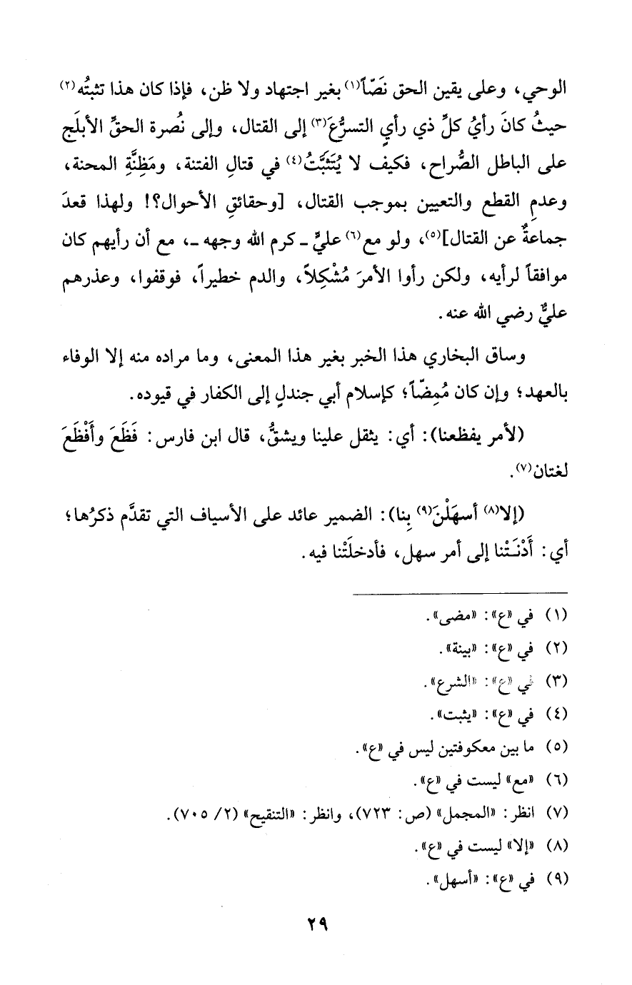الوحي، وعلى يقين الحق نَصّاً (¬1) بغير اجتهاد ولا ظن، فإذا كان هذا تثبتُه (¬2) حيثُ كانَ رأيُ كلِّ ذي رأيٍ التسرُّعَ (¬3) إلى القتال، وإلى نُصرة الحقِّ الأبلَج على الباطل الصُّراح، فكيف لا يُتَثَبَّتُ (¬4) في قتالِ الفتنة، ومَظِنَّةِ المحنة، وعدمِ القطع والتعيين بموجب القتال، [وحقائقِ الأحوال؟! ولهذا قعدَ جماعةٌ عن القتال] (¬5)، ولو مع (¬6) عليٍّ -كرم الله وجهه-، مع أن رأيهم كان موافقاً لرأيه، ولكن رأوا الأمرَ مُشْكِلاً، والدم خطيراً، فوقفوا، وعذرهم عليٌّ رضي الله عنه.