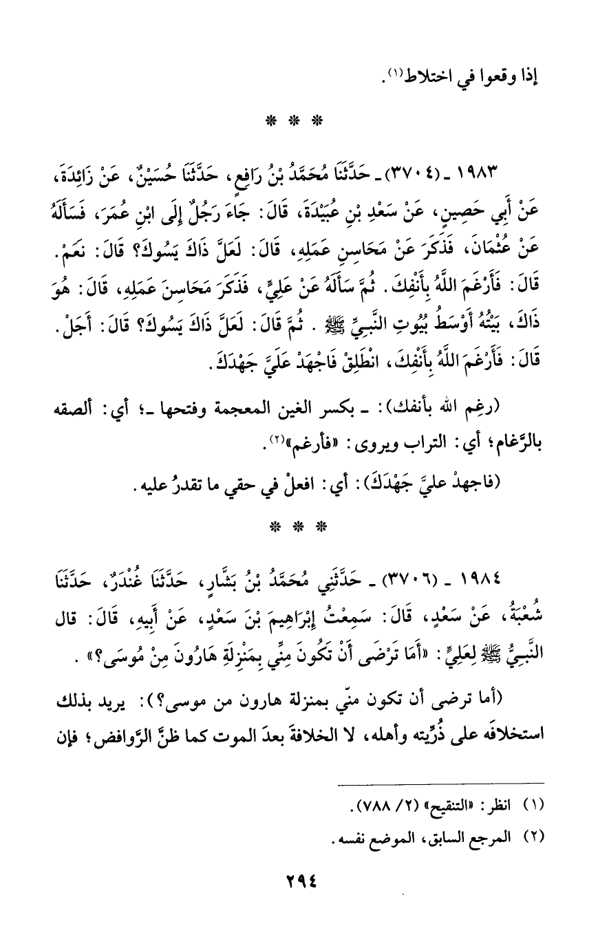 (أما ترضى أن تكون منّي بمنزلة هارون من موسى؟): يريد بذلك استخلافَه على ذُرِّيته وأهله، لا الخلافةَ بعدَ الموت كما ظنَّ الرَّوافض؛ فإن