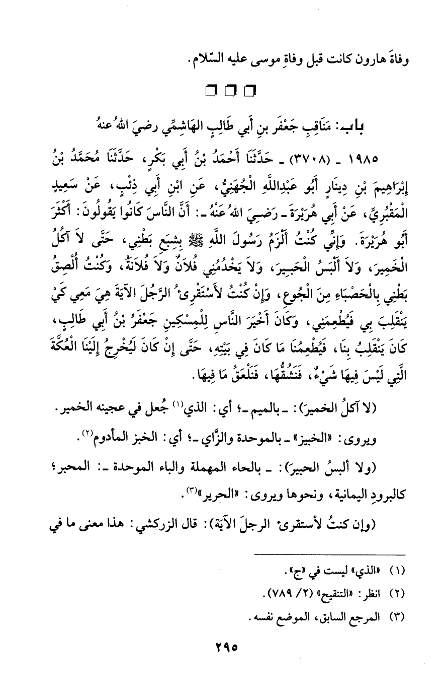 1985 - (3708) - حَدَّثَنَا أَحْمَدُ بْنُ أَبِي بَكْرٍ، حَدَّثَنَا مُحَمَدُ بْنُ إِبْرَاهِيمَ بْنِ دِينَارٍ أَبُو عَبْدِ اللَّهِ الْجُهَنِيُّ، عَنِ ابْنِ أبي ذِئْبٍ، عَنْ سَعِيدٍ الْمَقْبُرِيِّ، عَنْ أَبِي هُرَيْرَةَ - رضي الله عنه -: أَنَّ النَّاسَ كَانُوا يَقُولُونَ: أَكْثَرَ أَبُو هُرَيْرَةَ. وَإِنَي كُنْتُ أَلْزَمُ رَسُولَ اللَّهِ - صلى الله عليه وسلم - بِشِبَعِ بَطْنِي، حَتَّى لَا آكُلُ الْخَمِيرَ، وَلا أَلْبَسُ الحَبِيرَ، وَلا يَخدُمُنِي فُلَانٌ وَلا فُلَانَةُ، وَكُنْتُ أُلْصِقُ بَطْنِي بِالْحَصْبَاءِ مِنَ الْجُوعِ، وَإِنْ كُنْتُ لأَسْتَقْرِئُ الرَّجُلَ الآيَةَ هِيَ مَعِي كَيْ يَنْقَلِبَ بِي فَيُطْعِمَنِي، وَكَانَ أَخْيَرَ النَّاسِ لِلْمِسْكِينِ جَعْفَرُ بْنُ أَبِي طَالِبٍ، كَانَ يَنْقَلِبُ بِنَا، فَيُطْعِمُنَا مَا كَانَ فِي بَيْتِهِ، حَتَّى إِنْ كَانَ لَيُخْرِجُ إِلَيْنَا الْعُكَّةَ الَّتِي لَيْسَ فِيهَا شَيْءٌ، فَنَشُقُّهَا، فَنَلْعَقُ مَا فِيهَا.