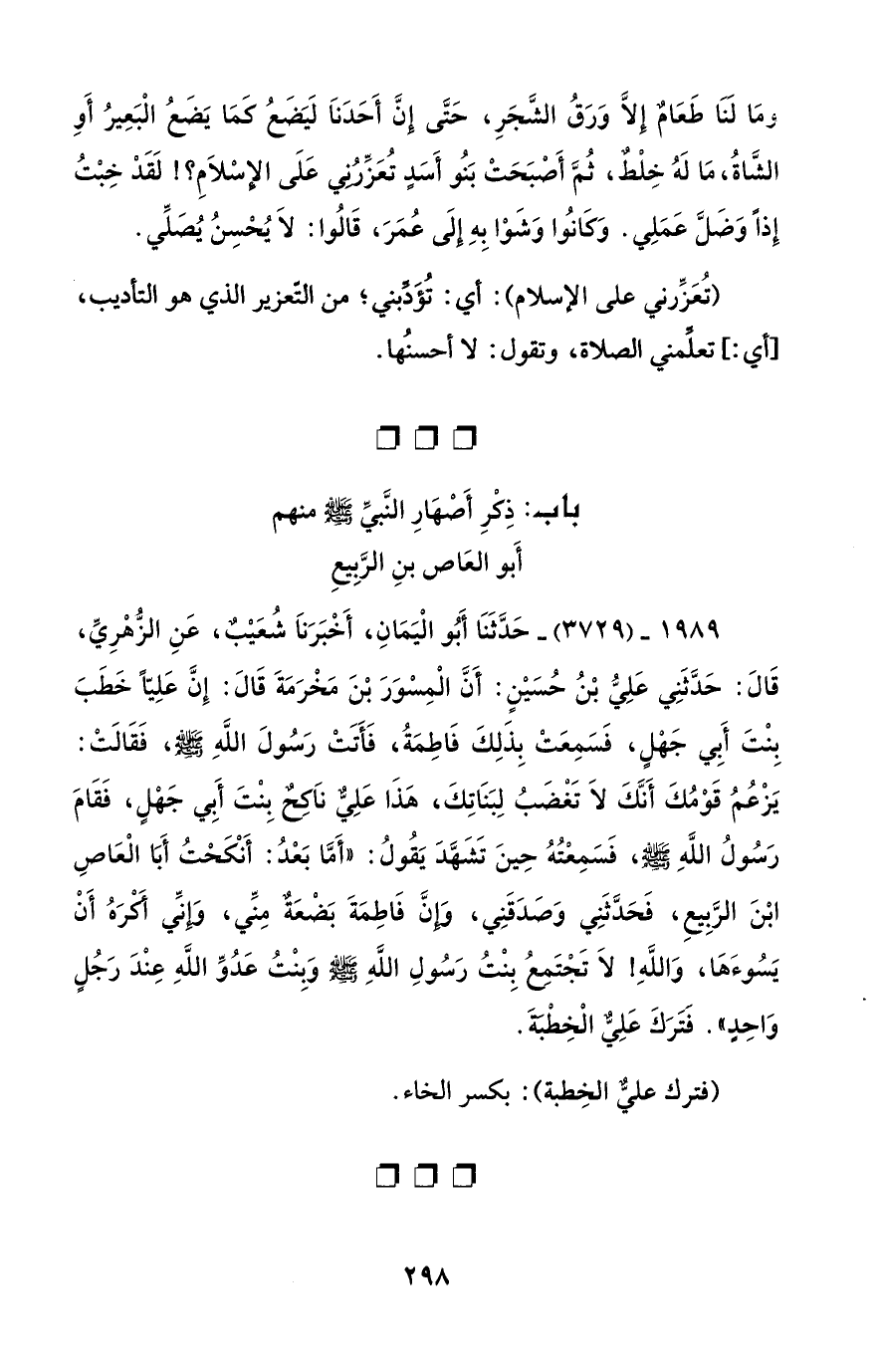 1989 - (3729) - حَدَّثَنَا أَبُو الْيَمَانِ، أَخْبَرَنَا شُعَيْبٌ، عَنِ الزُّهْرِيِّ، قَالَ: حَدَّثَنِي عَلِيُّ بْنُ حُسَيْنٍ: أَنَّ الْمِسْوَرَ بْنَ مَخْرَمَةَ قَالَ: إِنَّ عَلِيًّا خَطَبَ بِنْتَ أَبِى جَهْلٍ، فَسَمِعَتْ بِذَلِكَ فَاطِمَةُ، فَأَتَتْ رَسُولَ اللَّهِ - صلى الله عليه وسلم -، فَقَالَتْ: يَزْعُمُ قَوْمُكَ أَنَّكَ لَا تَغْضَبُ لِبَنَاتِكَ، هَذَا عَلِيٌّ نَاكِحٌ بِنْتَ أَبي جَهْلٍ، فَقَامَ رَسُولُ اللَّهِ - صلى الله عليه وسلم -، فَسَمِعْتُهُ حِينَ تَشَهَّدَ يَقُولُ: "أَمَّا بَعْدُ: أَنْكَحْتُ أَبَا الْعَاصِ ابْنَ الرَّبِيعِ، فَحَدَّثَنِي وَصَدَقَنِي، وَإِنَّ فَاطِمَةَ بَضْعَةٌ مِنِّي، وَإِنِّي أَكْرَهُ أَنْ يَسُوءَهَا، وَاللَّهِ! لَا تَجْتَمِعُ بِنْتُ رَسُولِ اللَّهِ - صلى الله عليه وسلم - وَبِنْتُ عَدُوِّ اللَّهِ عِنْدَ رَجُلٍ وَاحِدٍ". فَتَرَكَ عَلِيٌّ الْخِطْبَةَ.