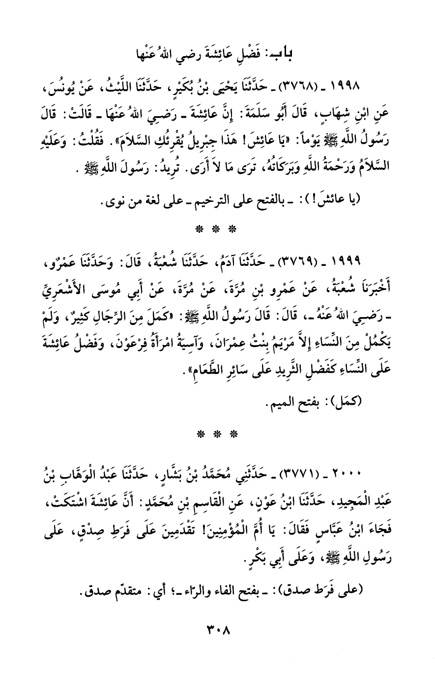 1999 - (3769) - حَدَّثَنَا آدَمُ، حَدَّثَنَا شُعْبَةُ، قَالَ: وَحَدَّثَنَا عَمْرٌو، أَخْبَرَنَا شُعْبَةُ، عَنْ عَمْرِو بْنِ مُرَّةَ، عَنْ مُرَّةَ، عَنْ أَبِي مُوسَى الأَشْعَرِيِّ - رضي الله عنه -، قَالَ: قَالَ رَسُولُ اللَّهِ - صلى الله عليه وسلم -: "كَمَلَ مِنَ الرِّجَالِ كَثِيرٌ، وَلَمْ يَكْمُلْ مِنَ النِّسَاءِ إِلَّا مَرْيَمُ بِنْتُ عِمْرَانَ، وَآسِيةُ امْرَأَةُ فِرْعَوْنَ، وَفَضْلُ عَائِشَةَ عَلَى النِّسَاءِ كَفَضْلِ الثَّرِيدِ عَلَى سَائِرِ الطَّعَامِ".