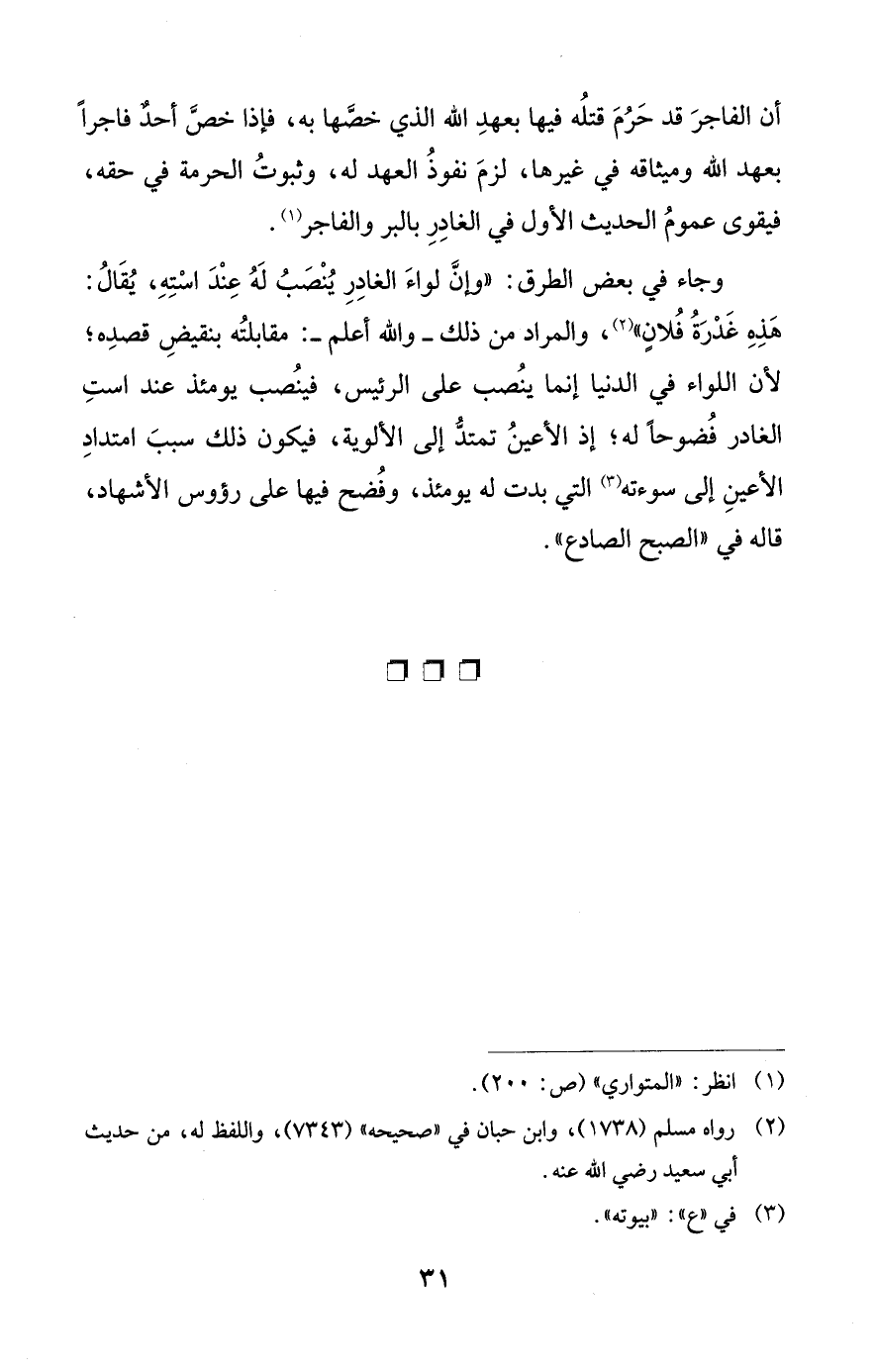وجاء في بعض الطرق: "وإنَّ لواءَ الغادِرِ يُنْصَبُ لَهُ عِنْدَ اسْتِهِ، يُقَالُ: هَذِهِ غَدْرَةُ فُلانٍ" (¬2)، والمراد من ذلك -والله أعلم-: مقابلتُه بنقيضِ قصدِه؛ لأن اللواء في الدنيا إنما ينُصب على الرئيس، فينُصب يومئذ عند استِ الغادر فُضوحاً له؛ إذ الأعينُ تمتدُّ إلى الألوية، فيكون ذلك سببَ امتدادِ الأعينِ إلى سوءته (¬3) التي بدت له يومئذ، وفُضح فيها على رؤوس الأشهاد، قاله في "الصبح الصادع".