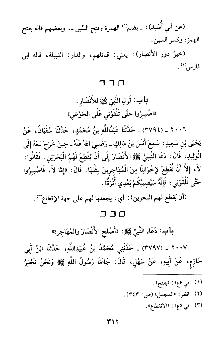 2006 - (3794) - حَدَّثَنَا عَبْدُ اللَّهِ بْنُ مُحَمَّدٍ، حَدَّثَنَا سُفْيَانُ، عَنْ يَحْيَى بْنِ سَعِيدٍ: سَمِعَ أَنَسَ بْنَ مَالِكٍ - رضي الله عنه - حِينَ خَرَجَ مَعَهُ إِلَى الْوَلِيدِ، قَالَ: دَعَا النَّبِيُّ - صلى الله عليه وسلم - الأَنْصَارَ إِلَى أَنْ يُقْطِعَ لَهُمُ الْبَحْرَيْنِ. فَقَالُوا: لَا، إِلَّا أَنْ تُقْطِعَ لإخْوَانِنَا مِنَ الْمُهَاجِرِينَ مِثْلَهَا. قَالَ: "إِمَّا لَا، فَاصْبِرُوا حَتَّى تَلْقَوْنِي؛ فَإِنَّهُ سَيُصِيبُكُمْ بَعْدِي أُثْرَةٌ".