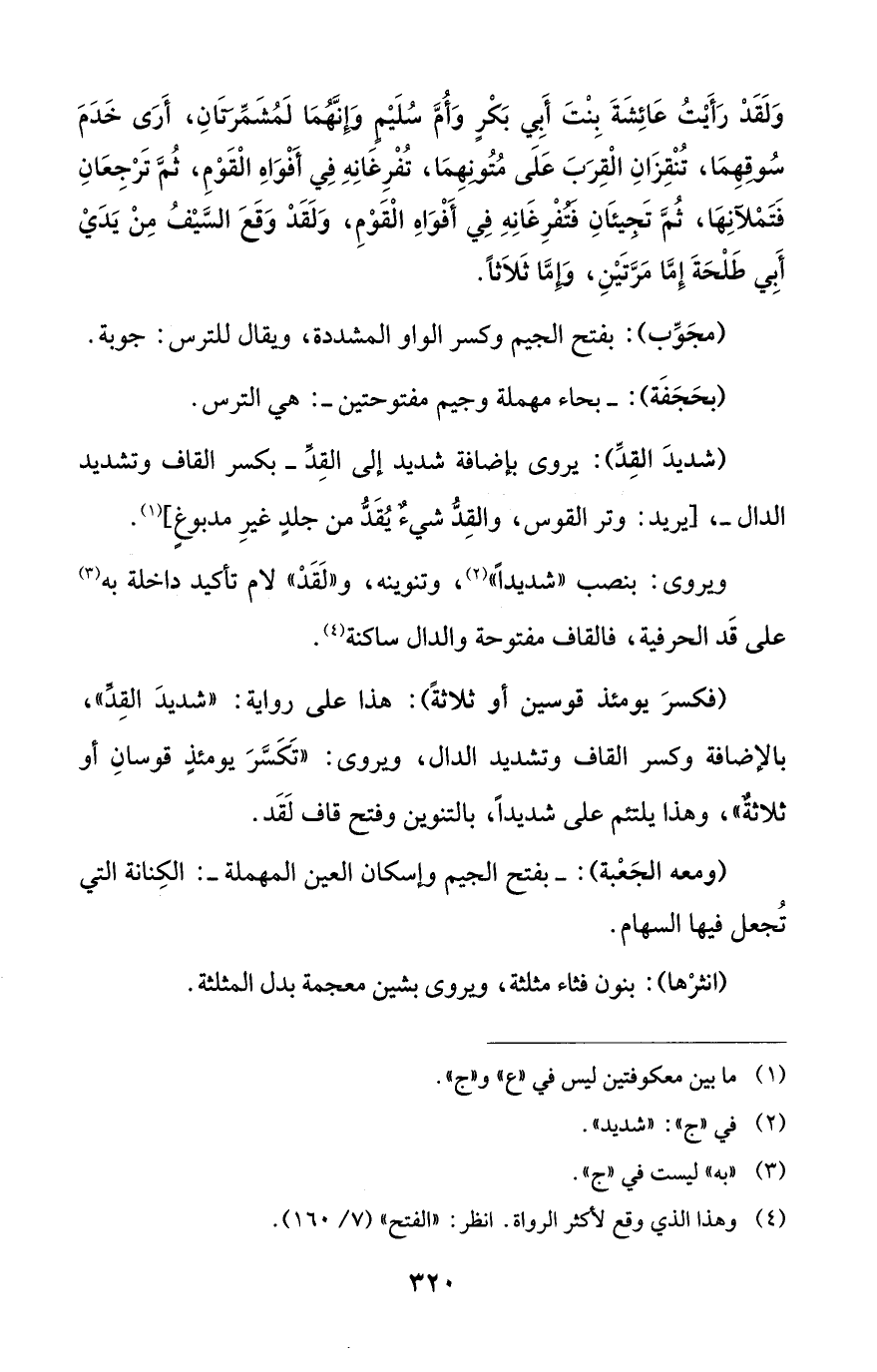 (فكسرَ يومئذ قوسين أو ثلاثةً): هذا على رواية: "شديدَ القِدِّ"، بالإضافة وكسر القاف وتشديد الدال، ويروى: "تَكَسَّرَ يومئذٍ قوسانِ أو ثلاثةٌ"، وهذا يلتئم على شديدًا، بالتنوين وفتح قاف لَقَد.