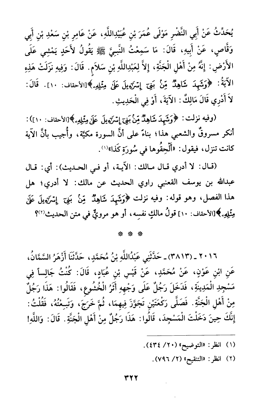 يُحَدِّثُ عَنْ أَبي النَّضْرِ مَوْلَى عُمَرَ بْنِ عُبَيْدِ اللَّهِ، عَنْ عَامِرِ بْنِ سَعْدِ بْنِ أَبِي وَقَّاصٍ، عَنْ أَبِيهِ، قَالَ: مَا سَمِعْتُ النَّبِيَّ - صلى الله عليه وسلم - يَقُولُ لأَحَدٍ يَمْشِي عَلَى الأَرْضِ: إِنَّهُ مِنْ أَهْلِ الْجَنَّةِ، إِلَّا لِعَبْدِ اللَّهِ بْنِ سَلَامٍ. قَالَ: وَفِيهِ نزَلَتْ هَذه الآيَةُ: {وَشَهِدَ شَاهِدٌ مِنْ بَنِي إِسْرَائِيلَ عَلَى مِثْلِهِ} [الأحقاف:10]. قَالَ: لَا أَدْرِي قَالَ مَالِكٌ: الآيَةَ، أَوْ فِي الْحَدِيثِ.