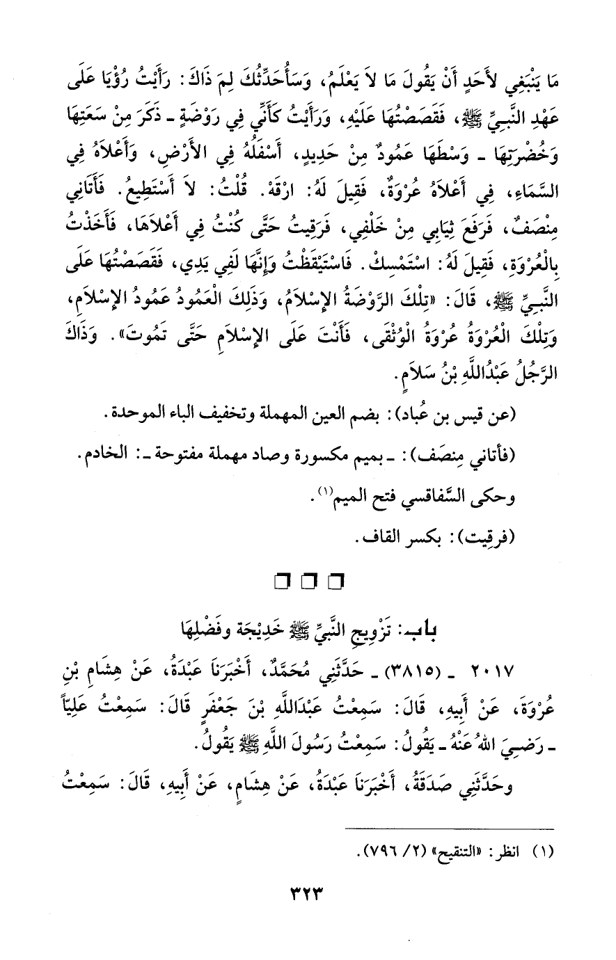 مَا يَنْبَغِي لأَحَدٍ أَنْ يَقُولَ مَا لَا يَعْلَمُ، وَسَأُحَدِّثُكَ لِمَ ذَاكَ: رَأَيْتُ رُؤْيَا عَلَى عَهْدِ النَّبِيِّ - صلى الله عليه وسلم -، فَقَصَصْتُهَا عَلَيْهِ، وَرَأَيْتُ كَأَنِّي فِي رَوْضَةٍ -ذَكَرَ مِنْ سَعَتِهَا وَخُضْرَتِهَا- وَسْطَهَا عَمُودٌ مِنْ حَدِيدٍ، أَسْفَلُهُ فِي الأَرْضِ، وَأَعْلَاهُ فِي السَّمَاءَ، فِي أَعْلَاهُ عُرْوَةٌ، فَقِيلَ لَهُ: ارْقَهْ. قُلْتُ: لَا أَسْتَطِيعُ. فَأَتَانِي مِنْصَفٌ، فَرَفَعَ ثِيَابِي مِنْ خَلْفِي، فَرَقِيتُ حَتَّى كُنْتُ فِي أَعْلَاهَا، فَأَخَذْتُ بِالْعُرْوَةِ، فَقِيلَ لَهُ: اسْتَمْسِكْ. فَاسْتَيْقَظْتُ وَإِنَّهَا لَفِي يَدِي، فَقَصَصْتُهَا عَلَى النَّبِيِّ - صلى الله عليه وسلم -، قَالَ: "تِلْكَ الرَّوْضَةُ الإسْلَامُ، وَذَلِكَ الْعَمُودُ عَمُودُ الإسْلَامِ، وَتلْكَ الْعُرْوَةُ عُرْوَةُ الْوُثْقَى، فَأَنْتَ عَلَى الإِسْلَامِ حَتَّى تَمُوتَ". وَذَاكَ الرَّجُلُ عَبْدُ اللَّهِ بْنُ سَلَامٍ.