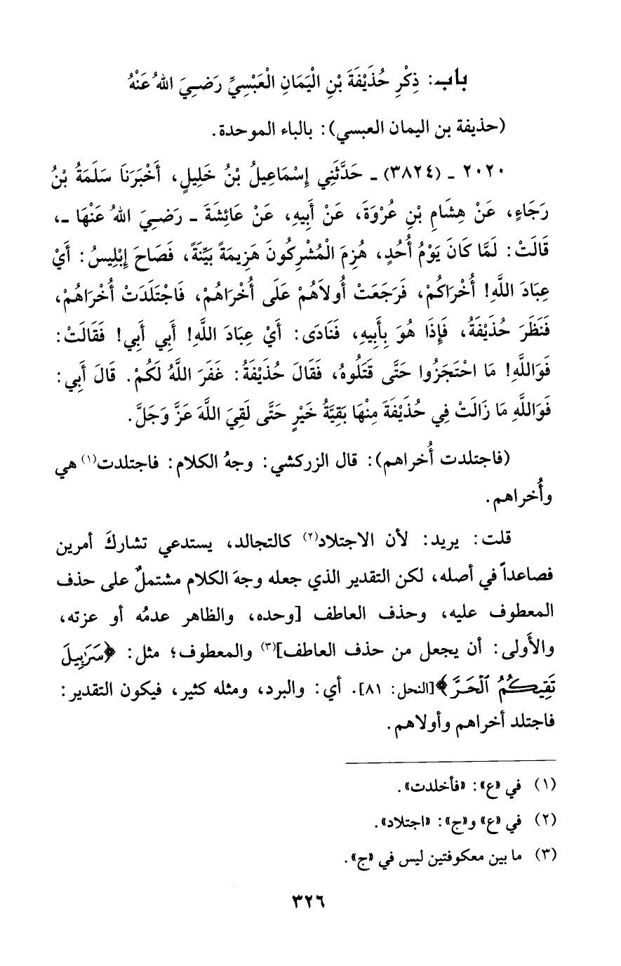 2020 - (3824) - حَدَّثَنِي إِسْمَاعِيلُ بْنُ خَلِيلٍ، أَخْبَرَنَا سَلَمَةُ بْنُ رَجَاءٍ، عَنْ هِشَامِ بْنِ عُرْوَةَ، عَنْ أَبيهِ، عَنْ عَائِشَةَ -رَضِيَ اللهُ عَنْهَا-، قَالَتْ: لَمَّا كانَ يَوْمُ أُحُدٍ، هُزِمَ الْمُشْرِكُونَ هَزِيمَةً بَيِّنَةً، فَصَاحَ إِبْلِيسُ: أَيْ عِبَادَ اللَّهِ! أُخْرَاكُمْ، فَرَجَعَتْ أُولَاهُمْ عَلَى أُخْرَاهُمْ، فَاجْتَلَدَتْ أُخْرَاهُمْ، فَنَظَرَ حُذَيْفَةُ، فَإِذَا هُوَ بِأَبِيهِ، فَنَادَى: أَيْ عِبَادَ اللَّهِ! أَبِي أَبِي! فَقَالَتْ: فَوَاللَّهِ! مَا احْتَجَزُوا حَتَّى قتلُوهُ، فَقَالَ حُذَيْفَةُ: غَفَرَ اللَّهُ لَكُمْ. قَالَ أَبي: فَوَاللَّهِ مَا زَالَتْ فِي حُذَيْفَةَ مِنْهَا بَقِيَّةُ خَيْرٍ حَتَّى لَقِيَ اللَّهَ -عَزَّ وَجَلَّ-.