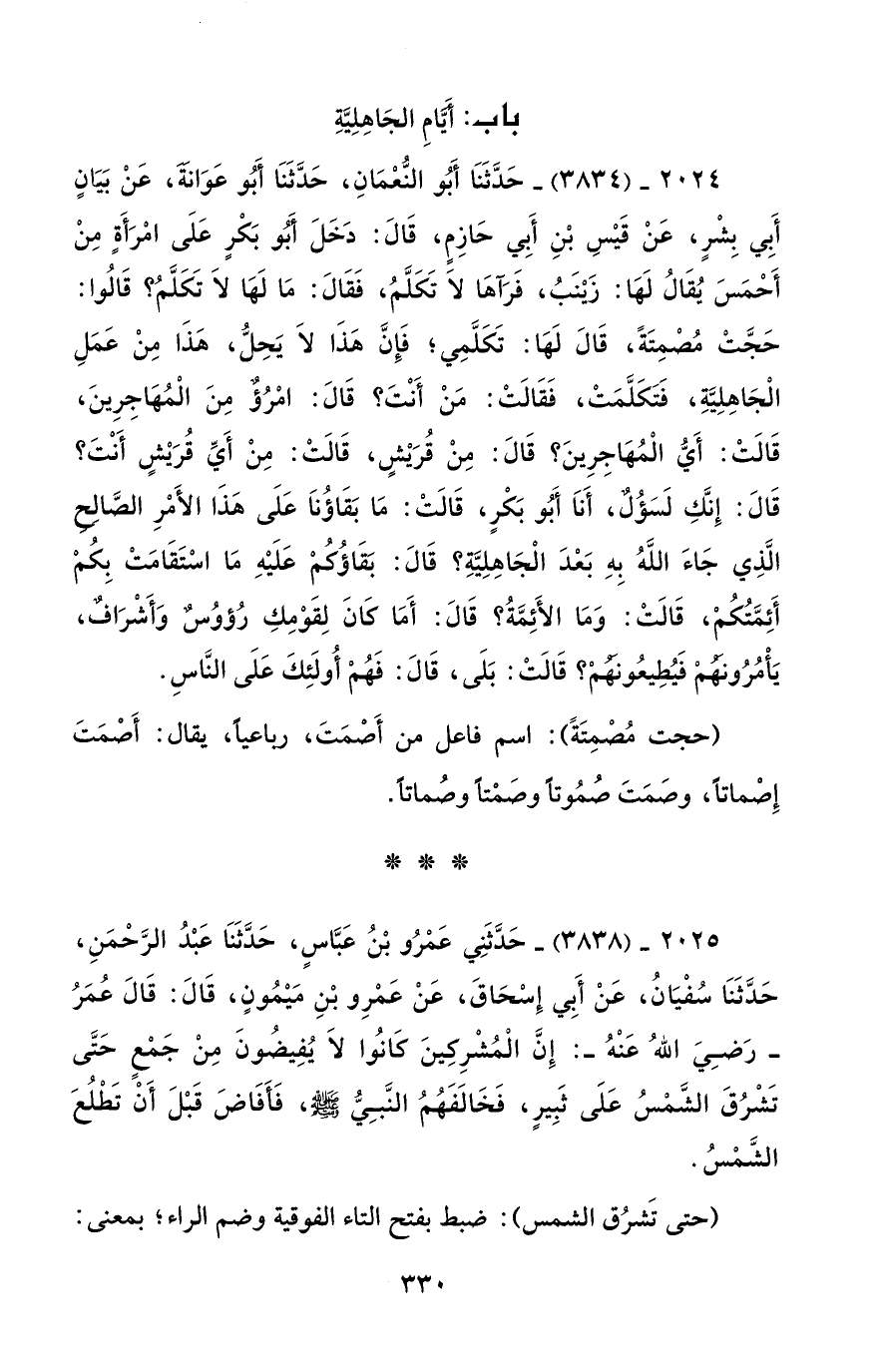 2024 - (3834) - حَدَّثَنَا أَبُو النُّعْمَانِ، حَدَّثَنَا أَبُو عَوَانة، عَنْ بَيَانٍ أَبي بِشْرٍ، عَنْ قَيْسِ بْنِ أَبِي حَازِمٍ، قَالَ: دَخَلَ أَبُو بَكْرٍ عَلَى امْرَأَةٍ مِنْ أَحْمَسَ يُقَالُ لَهَا: زَيْنَبُ، فَرَآهَا لا تَكَلَّمُ، فَقَالَ: مَا لَهَا لَا تَكَلَّمُ؟ قَالُوا: حَجَّتْ مُصْمِتَةً، قَالَ لَهَا: تَكَلَّمِي؛ فَإِنَّ هَذَا لَا يَحِلُّ، هَذَا مِنْ عَمَلِ الْجَاهِلِيَّةِ، فَتَكَلَّمَتْ، فَقَالَتْ: مَنْ أَنْتَ؟ قَالَ: امْرُؤٌ مِنَ الْمُهَاجِرِينَ، قَالَتْ: أَيُّ الْمُهَاجِرِينَ؟ قَالَ: مِنْ قُرَيْشٍ، قَالَتْ: مِنْ أَيِّ قُرَيْشٍ أَنْتَ؟ قَالَ: إِنَّكِ لَسَؤُلٌ، أَنَا أَبُو بَكْرٍ، قَالَتْ: مَا بَقَاؤُنَا عَلَى هَذَا الأَمْرِ الصَّالِحُ الَّذِي جَاءَ اللَّهُ بِهِ بَعْدَ الْجَاهِلِيَّةِ؟ قَالَ: بَقَاؤُكُمْ عَلَيْهِ مَا اسْتَقَامَتْ بِكُمْ أَئِمَّتُكُمْ، قَالَتْ: وَمَا الأَئِمَّةُ؟ قَالَ: أَمَا كَانَ لِقَوْمِكِ رُؤوُسٌ وَأَشْرَافٌ، يَأْمُرُونهمْ فَيُطِيعُونهمْ؟ قَالَتْ: بَلَى، قَالَ: فَهُمْ أُولَئِكَ عَلَى النَّاسِ.