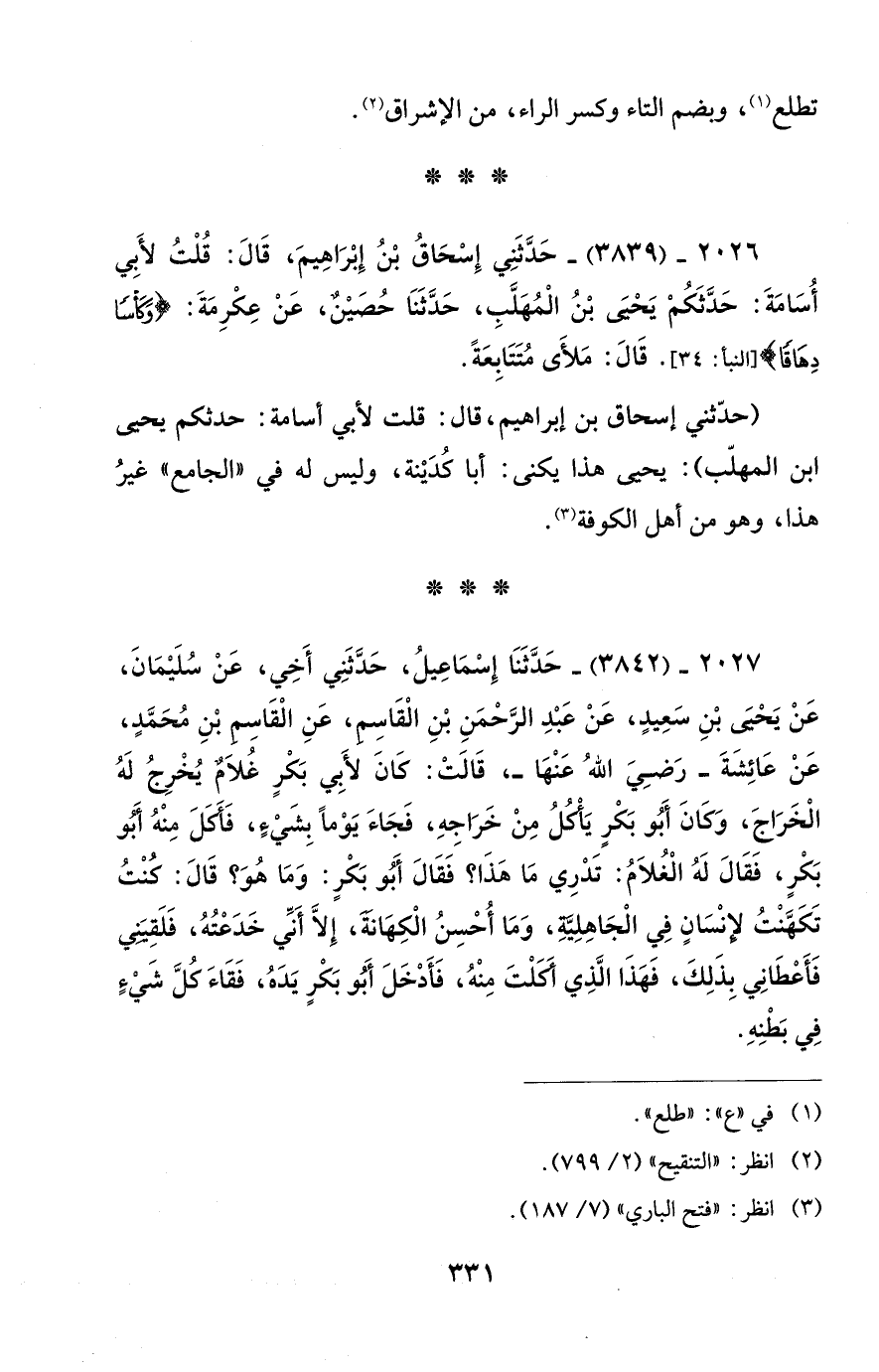 2026 - (3839) - حَدَّثَنِي إِسْحَاقُ بْنُ إِبْرَاهِيمَ، قَالَ: قُلْتُ لأَبِي أُسَامَةَ: حَدَّثَكُمْ يَحْيَى بْنُ الْمُهَلَّبِ، حَدَّثَنَا حُصَيْنٌ، عَنْ عِكْرِمَةَ: {وَكَأْسًا دِهَاقًا} [النبأ: 34]. قَالَ: مَلأَى مُتَتَابِعَةً.