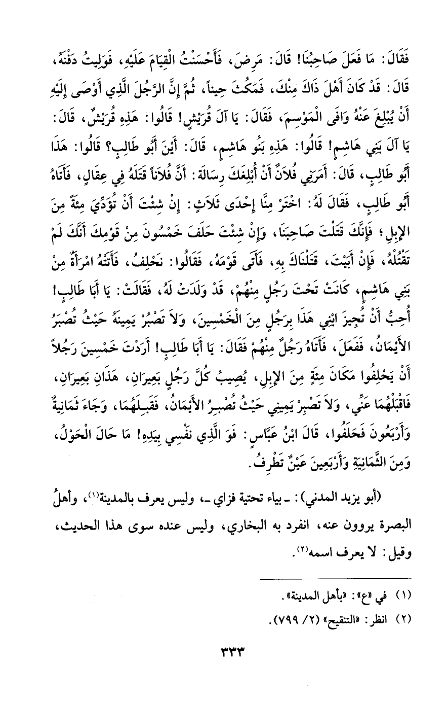 فَقَالَ: مَا فَعَلَ صَاحِبُنَا! قَالَ: مَرِضَ، فَأَحْسَنْتُ الْقِيَامَ عَلَيْهِ، فَوَلِيتُ دَفْنَهُ، قَالَ: قَدْ كَانَ أَهْلَ ذَاكَ مِنْكَ، فَمَكُثَ حِينًا، ثُمَّ إِنَّ الرَّجُلَ الَّذِي أَوْصَى إِلَيْهِ أَنْ يُبْلِغَ عَنْهُ وَافَى الْمَوْسِمَ، فَقَالَ: يَا آلَ قُرَيْشٍ! قَالُوا: هَذِهِ قُرَيْشٌ، قَالَ: يَا آلَ بَنِي هَاشِم! قَالُوا: هَذِهِ بَنُو هَاشِمٍ، قَالَ: أَيْنَ أبُو طَالِبٍ؟ قَالُوا: هَذَا أَبَو طَالِبٍ، قَالَ: أَمَرَنِي فُلَان أَنْ أُبْلِغَكَ رِسَالَة: أَنَّ فُلَانًا قتَلَهُ فِي عِقَالٍ، فَأَتَاهُ أَبُو طَالِبٍ، فَقَالَ لَهُ: اخْتَرْ مِنَّا إِحْدَى ثَلَاثٍ: إِنْ شِئْتَ أَنْ تُؤَدِّيَ مِئَةً مِنَ الإبِلِ؛ فَإِنَّكَ قتَلْتَ صَاحِبَنَا، وَإِنْ شِئْتَ حَلَفَ خَمْسُونَ مِنْ قَوْمِكَ أَنَّكَ لَمْ تَقْتُلْهُ، فَإِنْ أَبَيْتَ، قَتَلْنَاكَ بِهِ، فَأَتَى قَوْمَهُ، فَقَالُوا: نَحْلِفُ، فَأَتَتْهُ امْرَأةٌ مِنْ بَنِي هَاشِمٍ، كَانَتْ تَحْتَ رَجُلٍ مِنْهُمْ، قَدْ وَلَدَتْ لَهُ، فَقَالَتْ: يَا أَبَا طَالِبٍ! أُحِبُّ أَنْ تُجِيزَ ابْنِي هَذَا بِرَجُلٍ مِنَ الْخَمْسِينَ، وَلَا تَصْبُرْ يَمِينَهُ حَيْثُ تُصْبَرُ الأَيْمَانُ، فَفَعَلَ، فَأَتَاهُ رَجُلٌ مِنْهُمْ فَقَالَ: يَا أَبَا طَالِبٍ! أَرَدْتَ خَمْسِينَ رَجُلًا أَنْ يَحْلِفُوا مَكَانَ مِئَةٍ مِنَ الإِبِلِ، يُصِيبُ كُلَّ رَجُلٍ بَعِيرَانِ، هَذَانِ بَعِيرَانِ، فَاقْبَلْهُمَا عَنِّي، وَلَا تَصْبِرْ يَمِينِي حَيْثُ تُصْبِرُ الأَيْمَانُ، فَقَبِلَهُمَا، وَجَاءَ ثَمَانِيةٌ وَأَرْبَعُونَ فَحَلَفُوا، قَالَ ابْنُ عَبَّاسٍ: فَوَالَّذِي نفسِي بِيَدِهِ! مَا حَالَ الْحَوْلُ، وَمِنَ الثَّمَانِيَةِ وَأَرْبَعِينَ عَيْنٌ تَطْرِفُ.