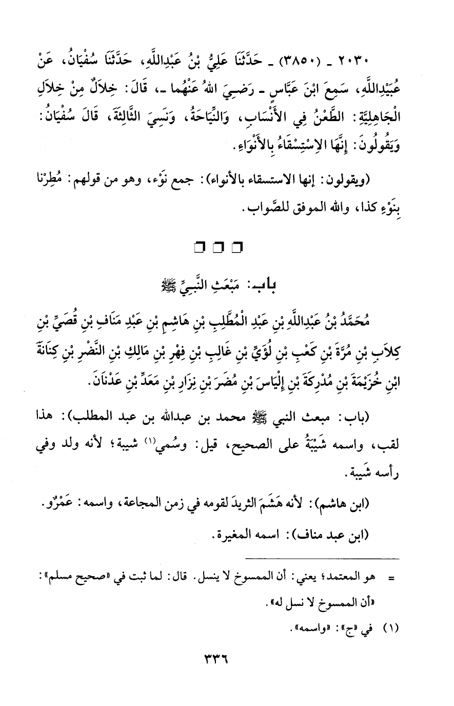 (باب: مبعث النبي - صلى الله عليه وسلم - محمد بن عبد الله بن عبد المطلب): هذا لقب، واسمه شَيْبَةُ على الصحيح، قيل: وسُمي (¬1) شيبة؛ لأنه ولد وفي رأسه شَيبة.