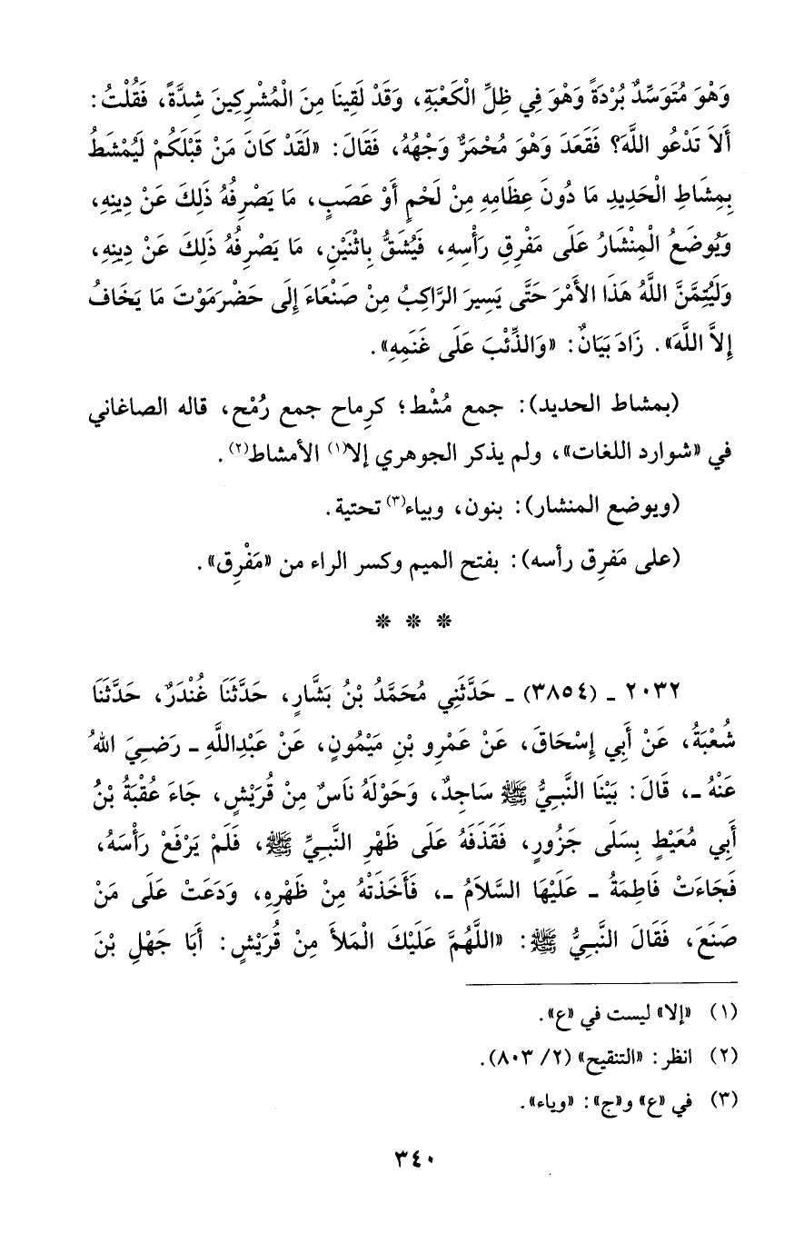 2032 - (3854) - حَدَّثَنِي مُحَمَّدُ بْنُ بَشَّارٍ، حَدَّثَنَا غُنْدَرٌ، حَدَّثَنَا شُعْبَةُ، عَنْ أَبي إِسْحَاقَ، عَنْ عَمْرِو بْنِ مَيْمُونٍ، عَنْ عَبْدِ اللَّهِ - رضي الله عنه -، قَالَ: بَيْنَا النَّبِيُّ - صلى الله عليه وسلم - سَاجِدٌ، وَحَوْلَهُ نَاسٌ مِنْ قُرَيْشٍ، جَاءَ عُقْبَةُ بْنُ أَبي مُعَيْطٍ بِسَلَى جَزُورٍ، فَقَذَفَهُ عَلَى ظَهْرِ النَّبِيِّ - صلى الله عليه وسلم -، فَلَمْ يَرْفَعْ رَأْسَهُ، فَجَاءَتْ فَاطِمَةُ -عَلَيْهَا السَّلَامُ-، فَأَخَذَتْهُ مِنْ ظَهْرِهِ، وَدَعَتْ عَلَى مَنْ صَنَعَ، فَقَالَ النَّبِيُّ - صلى الله عليه وسلم -: "اللَّهُمَّ عَلَيْكَ الْمَلأَ مِنْ قُرَيْشٍ: أَبَا جَهْلِ بْنَ