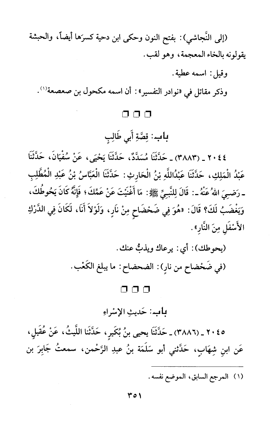 2044 - (3883) - حَدَّثَنَا مُسَدَّدٌ، حَدَّثَنَا يَحْيَى، عَنْ سُفْيَانَ، حَدَّثَنَا عَبْدُ الْمَلِكِ، حَدَّثَنَا عَبْدُ اللهِ بْنُ الْحَارِثِ: حَدَّثَنَا الْعَبَّاسُ بْنُ عَبْدِ الْمُطَّلِبِ - رضي الله عنه -: قَالَ لِلنَّبِيِّ - صلى الله عليه وسلم -: مَا أَغْنَيْتَ عَنْ عَمِّكَ؛ فَإِنَّهُ كَانَ يَحُوطُكَ، وَيَغْضَبُ لَكَ؟ قَالَ: "هُوَ فِي ضَحْضَاحٍ مِنْ نَارٍ، وَلَوْلَا أَنَا، لَكَانَ فِي الدَّرْكِ الأَسْفَلِ مِنَ النَّارِ".