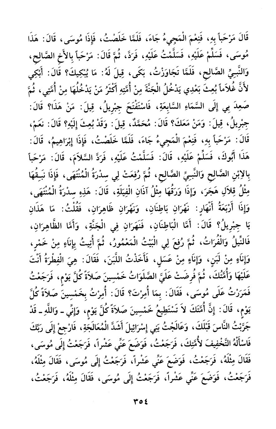 قَالَ مَرْحَبًا بِهِ، فَنِعْمَ الْمَجيءُ جَاءَ، فَلَمَّا خَلَصْتُ، فَإِذَا مُوسَى، قَالَ: هَذَا مُوسَى، فَسَلِّمْ عَلَيْهِ، فَسَلَّمْتُ عَلَيْهِ، فَرَدَّ، ثُمَّ قَالَ: مَرْحَبًا بِالأَخِ الصَّالِحُ، وَالنَّبِيِّ الصَّالِحُ، فَلَمَّا تَجَاوَزْتُ، بَكَى، قِيلَ لَهُ: مَا يُبْكِيكَ؟ قَالَ: أَبْكِي لأَنَّ غُلَامًا بُعِثَ بَعْدِي يَدْخُلُ الْجَنَّةَ مِنْ أُمَّتِهِ أَكْثَرُ مَنْ يَدْخُلُهَا مِنْ أُمَّتِي، ثُمَّ صَعِدَ بِي إِلَى السَّمَاءِ السَّابِعَةِ، فَاسْتَفْتَحَ جِبْرِيلُ، قِيلَ: مَنْ هَذَا؟ قَالَ: جِبْرِيلُ، قِيلَ: وَمَنْ مَعَكَ؟ قَالَ: مُحَمَّدٌ، قِيلَ: وَقَدْ بُعِثَ إِلَيْهِ؟ قَالَ: نَعَمْ، قَالَ: مَرْحَبًا بِهِ، فَنِعْمَ الْمَجِيءُ جَاءَ، فَلَمَّا خَلَصْتُ، فَإِذَا إِبْرَاهِيمُ، قَالَ: هَذَا أَبُوكَ، فَسَلِّمْ عَلَيْهِ، قَالَ: فَسَلَّمْتُ عَلَيْهِ، فَرَدَّ السَّلَامَ، قَالَ: مَرْحَبًا بِالاِبْنِ الصَّالِحُ وَالنَّبِيِّ الصَّالِحُ، ثُمَّ رُفِعَتْ لِي سِدْرَةُ الْمُنْتَهَى، فَإِذَا نَبِقُهَا مِثْلُ قِلَالِ هَجَرَ، وَإِذَا وَرَقُهَا مِثْلُ آذَانِ الْفِيَلَةِ، قَالَ: هَذِهِ سِدْرَةُ الْمُنْتَهَى، وَإِذَا أَرْبَعَةُ أَنْهَارٍ: نَهْرَانِ بَاطِنَانِ، وَنَهْرَانِ ظَاهِرَانِ، فَقُلْتُ: مَا هَذَانِ يَا جِبْرِيلُ؟ قَالَ: أَمَّا الْبَاطِنَانِ، فَنَهَرَانِ فِي الْجَنَّةِ، وَأَمَّا الظَّاهِرَانِ، فَالنِّيلُ وَالْفُرَاتُ، ثُمَّ رُفِعَ لِي الْبَيْتُ الْمَعْمُورُ، ثُمَّ أُتِيتُ بِإِنَاءٍ مِنْ خَمْرٍ، وَإِنَاءٍ مِنْ لَبَنٍ، وَإِنَاءٍ مِنْ عَسَلٍ، فَأَخَذْتُ اللَّبَنَ، فَقَالَ: هِيَ الْفِطْرَةُ أَنْتَ عَلَيْهَا وَأمُّتُكَ، ثُمَّ فُرِضَتْ عَلَيَّ الصَّلَوَاتُ خَمْسِينَ صَلَاةً كُلَّ يَوْمٍ، فَرَجَعْتُ فَمَرَرْتُ عَلَى مُوسَى، فَقَالَ: بِمَا أُمِرْتَ؟ قَالَ: أُمِرْتُ بِخَمْسِينَ صَلَاةً كُلَّ يَوْمٍ، قَالَ: إِنَّ أُمَّتَكَ لَا تَسْتَطِيعُ خَمْسِينَ صَلَاةً كُلَّ يَوْمٍ، وَإِنَيِّ -وَاللَّهِ- قَدْ جَرَّبْتُ النَّاسَ قَبْلَكَ، وَعَالَجْتُ بَنِي إِسْرَائِيلَ أَشَدَّ الْمُعَالَجَةِ، فَارْجِعْ إِلَى رَبِّكَ فَاسْأَلْهُ التَّخْفِيفَ لأُمَّتِكَ، فَرَجَعْتُ، فَوَضَعَ عَنِّي عَشْرًا، فَرَجَعْتُ إِلَى مُوسَى، فَقَالَ مِثْلَهُ، فَرَجَعْتُ، فَوَضَعَ عَنِّي عَشْرًا، فَرَجَعْتُ إِلَى مُوسَى، فَقَالَ مِثْلَهُ، فَرَجَعْتُ، فَوَضَعَ عَنِّي عَشْرًا، فَرَجَعْتُ إِلَى مُوسَى، فَقَالَ مِثْلَهُ، فَرَجَعْتُ،