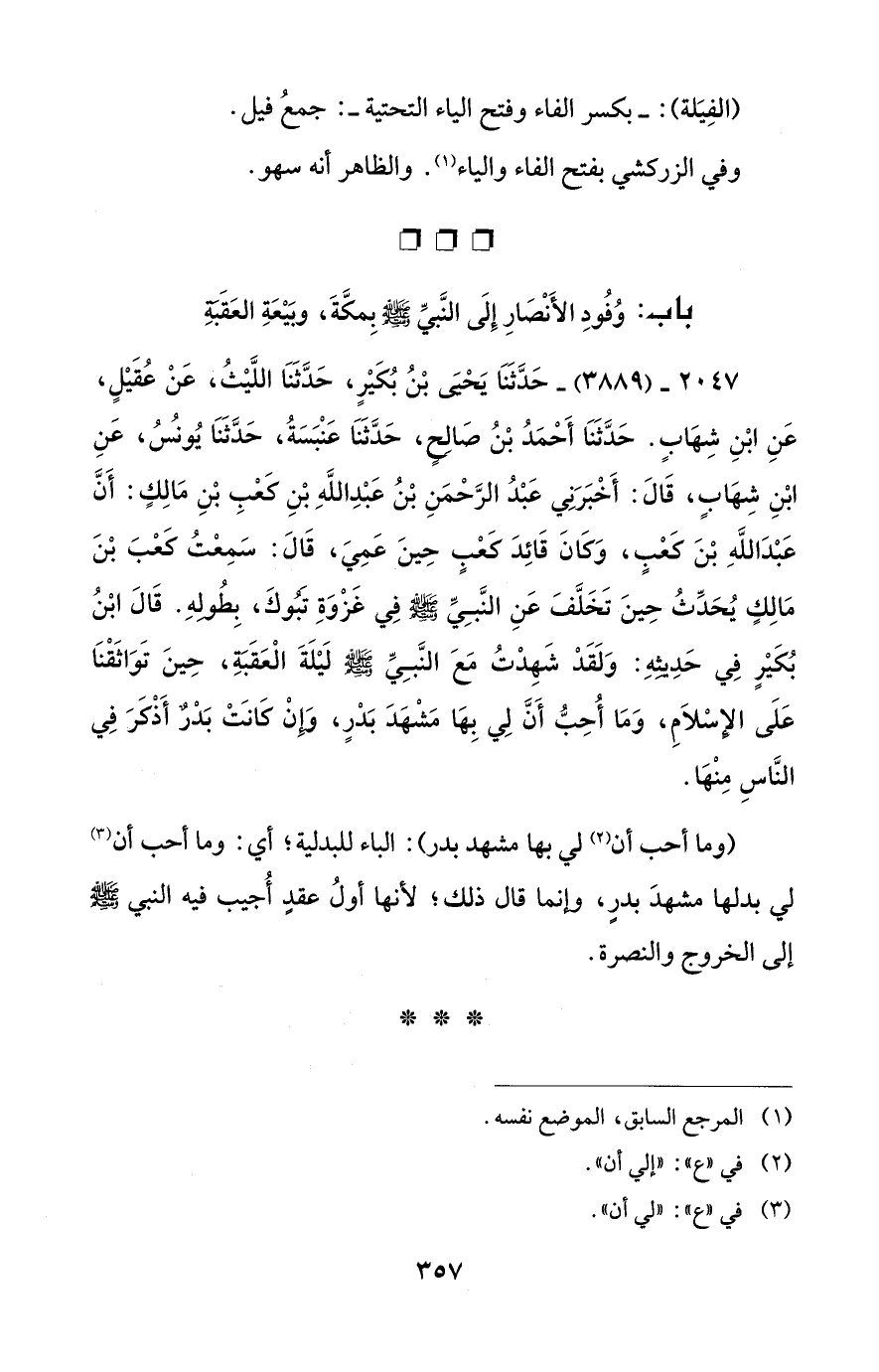 2047 - (3889) - حَدَّثَنَا يَحْيَى بْنُ بُكَيْرٍ، حَدَّثَنَا اللَّيْثُ، عَنْ عُقَيْلٍ، عَنِ ابْنِ شِهَابٍ. حَدَّثَنَا أَحْمَدُ بْنُ صَالِحٍ، حَدَّثَنَا عَنْبَسَةُ، حَدَّثَنَا يُونُسُ، عَنِ ابْنِ شِهَابٍ، قَالَ: أَخْبَرَنِي عَبْدُ الرَحْمَنِ بْنُ عَبْدِ اللَّهِ بْنِ كَعْبِ بْنِ مَالِكٍ: أَنَّ عَبْدَ اللَّهِ بْنَ كَعْبٍ، وَكَانَ قَائِدَ كعْبٍ حِينَ عَمِيَ، قَالَ: سَمِعْتُ كَعْبَ بْنَ مَالِكٍ يُحَدِّثُ حِينَ تَخَلَّفَ عَنِ النَّبِيِّ - صلى الله عليه وسلم - فِي غَزْوَةِ تَبُوكَ، بِطُولهِ. قَالَ ابْنُ بُكَيْرٍ فِي حَدِيثهِ: وَلَقَدْ شَهِدْتُ مَعَ النَّبِيِّ - صلى الله عليه وسلم - لَيْلَةَ الْعَقَبَةِ، حِينَ تَوَاثَقْنَا عَلَى الإِسْلَامِ، وَمَا أُحِبُّ أَنَّ لِي بِهَا مَشْهَدَ بَدْرٍ، وَإِنْ كَانَتْ بَدْرٌ أَذْكَرَ فِي النَّاسِ مِنْهَا.