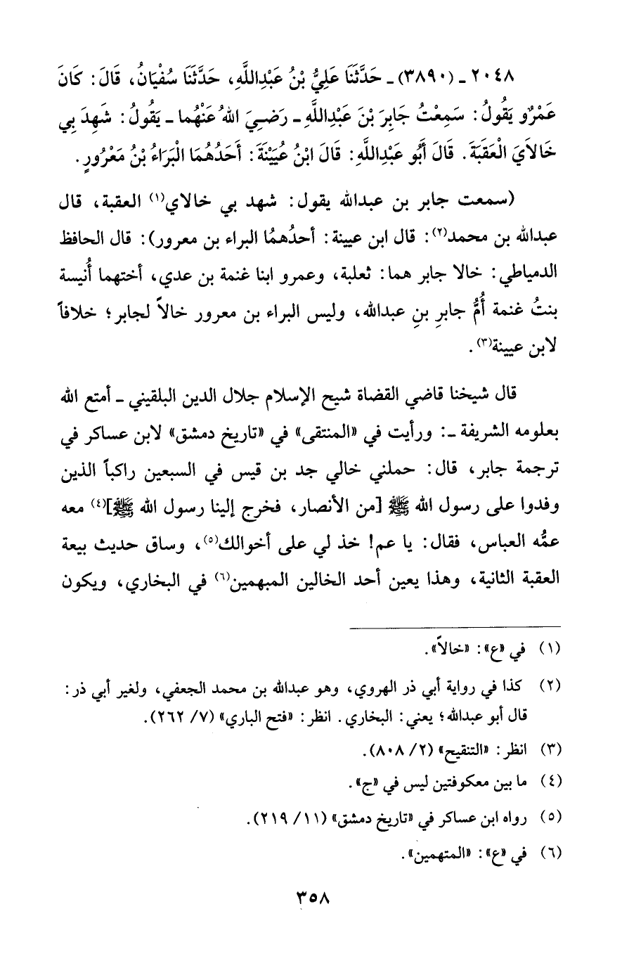 2048 - (3890) - حَدَّثَنَا عَلِيُّ بْنُ عَبْدِ اللَّهِ، حَدَّثَنَا سُفْيَانُ، قَالَ: كَانَ عَمْرٌو يَقُولُ: سَمِعْتُ جَابِرَ بْنَ عَبْدِ اللَّهِ -رَضِيَ اللهُ عَنْهُما- يَقُولُ: شَهِدَ بِي خَالَايَ الْعَقَبَةَ. قَالَ أَبُو عَبْدِ اللَّهِ: قَالَ ابْنُ عُيَيْنَةَ: أَحَدُهُمَا الْبَرَاءُ بْنُ مَعْرُورٍ.