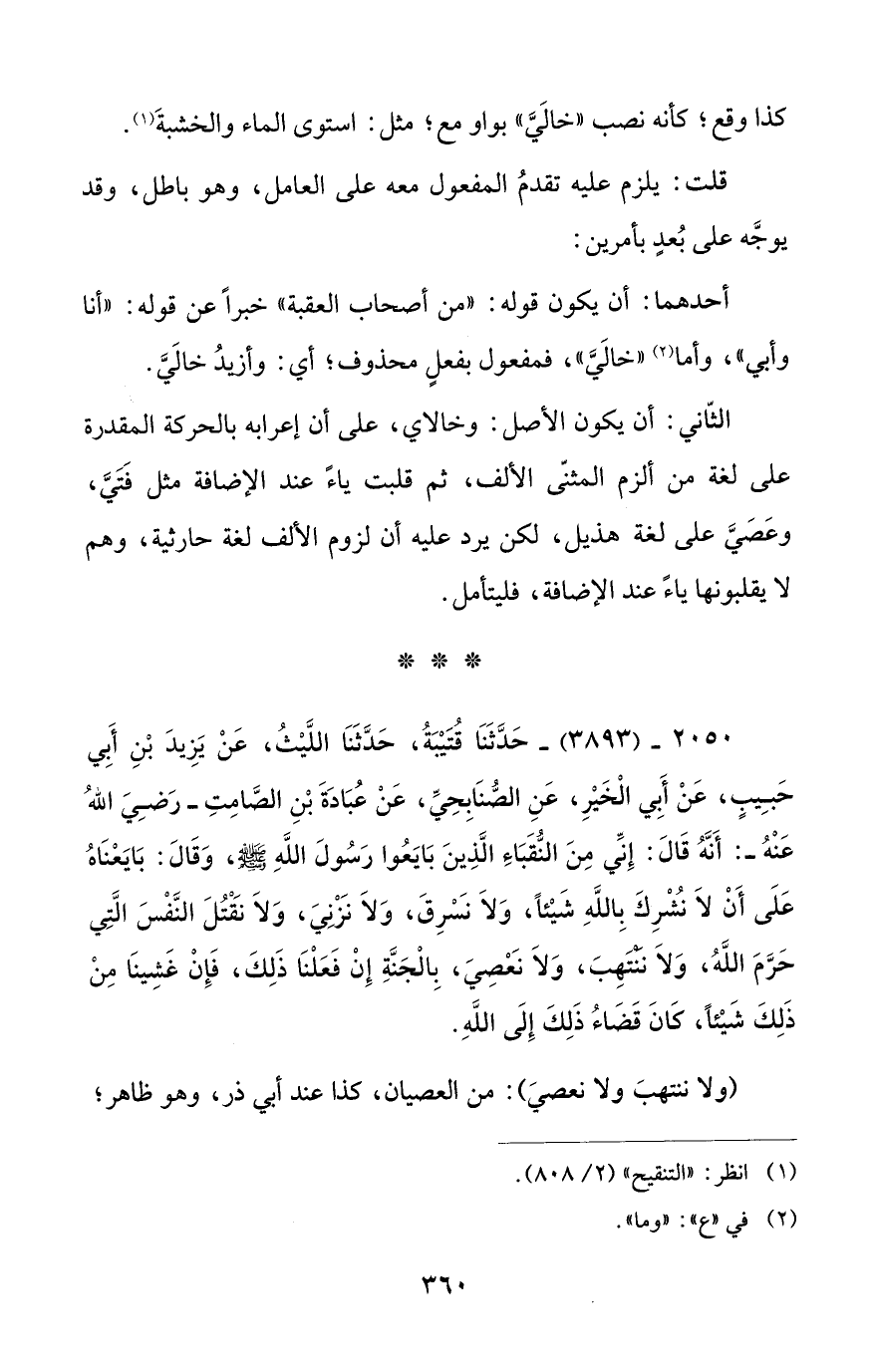 2050 - (3893) - حَدَّثَنَا قُتَيْبَةُ، حَدَّثَنَا اللَّيْثُ، عَنْ يَزِيدَ بْنِ أَبِي حَبِيبٍ، عَنْ أَبي الْخَيْرِ، عَنِ الصُّنَابِحِيِّ، عَن عُبَادَةَ بْنِ الصَّامِتِ - رضي الله عنه -: أَنَّهُ قَالَ: إِنِّي مِنَ النُّقَبَاءَ الَّذِينَ بَايَعُوا رَسُولَ اللَّهِ - صلى الله عليه وسلم -، وَقَالَ: بَايَعْنَاهُ عَلَى أَنْ لَا نُشْرِكَ بِاللَّهِ شَيْئًا، وَلَا نسرِقَ، وَلَا نَزْنِيَ، وَلَا نَقْتُلَ النَّفْسَ الَّتِي حَرَّمَ اللَّهُ، وَلَا نَنْتَهِبَ، وَلَا نَعْصِيَ، بِالْجَنَّةِ إِنْ فَعَلْنَا ذَلِكَ، فَإِنْ غَشِينَا مِنْ ذَلِكَ شَيْئًا، كَانَ قَضَاءُ ذَلِكَ إِلَى اللَّهِ.