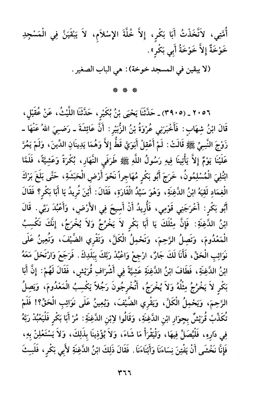 2056 - (3905) - حَدَّثَنَا يَحْيَى بْنُ بُكَيْرٍ، حَدَّثَنَا اللَّيْثُ، عَنْ عُقَيْلٍ، قَالَ ابْنُ شِهَابٍ: فَأَخْبَرَنِي عُرْوَةُ بْنُ الزُّبَيْرِ: أَنَّ عَائِشَةَ -رَضِيَ اللهُ عَنْهَا- زَوْجَ النَّبِيِّ - صلى الله عليه وسلم - قَالَتْ: لَمْ أَعْقِلْ أَبَوَيَّ قَطُّ إِلَّا وَهُمَا يَدِينَانِ الدِّينَ، وَلَمْ يَمُرَّ عَلَيْنَا يَوْمٌ إِلَّا يَأْتِينَا فِيهِ رَسُولُ اللَّهِ - صلى الله عليه وسلم - طَرَفَيِ النَّهَارِ، بُكْرَةً وَعَشِيَّةً، فَلَمَّا ابْتُلِيَ الْمُسْلِمُونُ، خَرَجَ أَبُو بَكْرٍ مُهَاجِرًا نَحْوَ أَرْضِ الْحَبَشَةِ، حَتَّى بَلَغَ بَرْكَ الْغِمَادِ لَقِيَهُ ابْنُ الدَّغِنَةِ، وَهْوَ سَيِّدُ الْقَارَةِ، فَقَالَ: أَيْنَ تُرِيدُ يَا أَبَا بَكْرٍ؟ فَقَالَ أَبُو بَكْرٍ: أَخْرَجَنِي قَوْمِي، فَأُرِيدُ أَنْ أَسِيحَ فِي الأَرْضِ، وَأَعْبُدَ رَبِّي. قَالَ ابْنُ الدَّغِنَةِ: فَإِنَّ مِثْلَكَ يَا أَبَا بَكْرٍ لَا يَخْرُجُ وَلَا يُخْرَجُ، إِنَّكَ تَكْسِبُ الْمَعْدُومَ، وَتَصِلُ الرَّحِمَ، وَتَحْمِلُ الْكَلَّ، وَتَقْرِي الضَّيْفَ، وَتُعِينُ عَلَى نَوَائِبِ الْحَقِّ، فَأَنَا لَكَ جَارٌ، ارْجِعْ وَاعْبُدْ رَبَّكَ بِبَلَدِكَ. فَرَجَعَ وَارْتَحَلَ مَعَهُ ابْنُ الدَّغِنَةِ، فَطَافَ ابْنُ الدَّغِنَةِ عَشِيَّةً فِي أَشْرَافِ قُرَيْشٍ، فَقَالَ لَهُمْ: إِنَّ أَبَا بَكْرٍ لَا يَخْرُجُ مِثْلُهُ وَلَا يُخْرَجُ، أتخْرِجُونَ رَجُلًا يَكْسِبُ الْمَعْدُومَ، وَيَصِلُ الرَّحِمَ، وَيَحْمِلُ الْكَلَّ، وَيَقْرِي الضَّيْفَ، وَيُعِينُ عَلَى نَوَائِبِ الْحَقِّ؟! فَلَمْ تُكَذِّبْ قُرَيْشٌ بِجوَارِ ابْنِ الدَّغِنَةِ، وَقَالُوا لاِبْنِ الدَّغِنَةِ: مُرْ أَبَا بَكْرٍ فَلْيَعْبُدْ رَبَّهُ فِي دَارِهِ، فَلْيُصَلِّ فِيهَا، وَلْيَقْرَأْ مَا شَاءَ، وَلَا يُؤْذِينَا بِذَلِكَ، وَلَا يَسْتَعْلِنْ بِهِ، فَإِنَّا نَخْشَى أَنْ يَفْتِنَ نِسَاءَنَا وَأَبْنَاءَنَا. فَقَالَ ذَلِكَ ابْنُ الدَّغِنَةِ لأَبِي بَكْرٍ، فَلَبِثَ