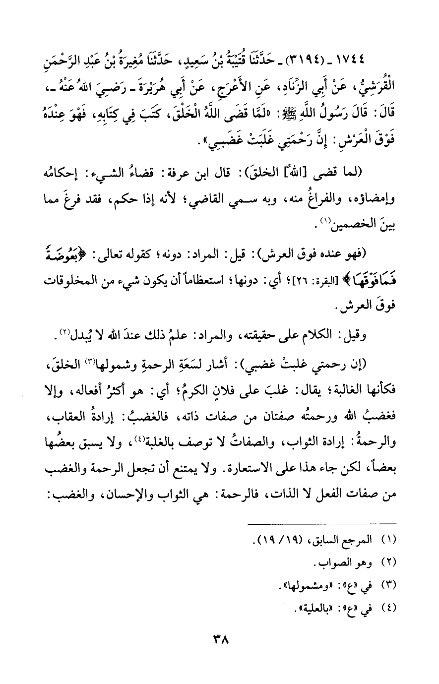 1744 - (3194) - حَدَّثَنَا قُتَيْبَةُ بْنُ سَعِيدٍ، حَدَّثَنَا مُغِيرَةُ بْنُ عَبْدِ الرَّحْمَنِ الْقُرَشِيُّ، عَنْ أَبِي الزِّنَادِ، عَنِ الأَعْرَجِ، عَنْ أَبِي هُرَيْرَةَ -رَضِيَ اللهُ عَنْهُ-، قَالَ: قَالَ رَسُولُ اللهِ - صلى الله عليه وسلم -: "لَمَّا قَضَى اللهُ الْخَلْقَ، كَتَبَ فِي كِتَابِهِ، فَهْوَ عِنْدَهُ فَوْقَ الْعَرْشِ: إِنَّ رَحْمَتِي غَلَبَتْ غَضَبِي".