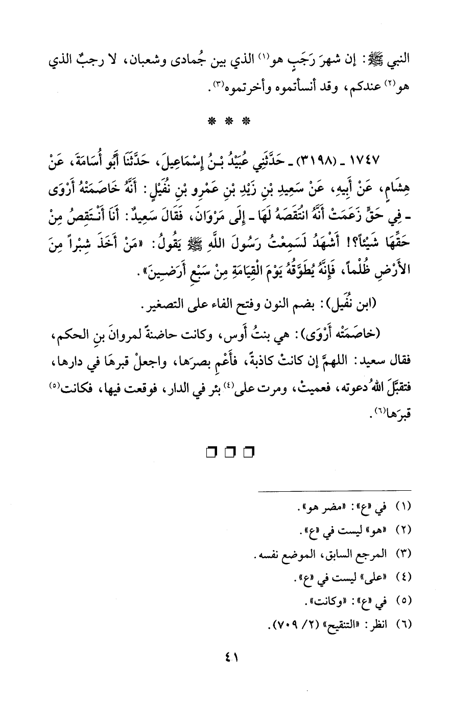 1747 - (3198) - حَدَّثَنِي عُبَيْدُ بْنُ إِسْمَاعِيلَ، حَدَّثَنَا أَبُو أُسَامَةَ، عَنْ هِشَامٍ، عَنْ أَبِيهِ، عَنْ سَعِيدِ بْنِ زَيْدِ بْنِ عَمْرِو بْنِ نُفَيْلٍ: أَنَّهُ خَاصَمَتْهُ أَرْوَى -فِي حَقٍّ زَعَمَتْ أَنَّهُ انْتَقَصَهُ لَهَا- إِلَى مَرْوَانَ، فَقَالَ سَعِيدٌ: أَنَا أَنْتَقِصُ مِنْ حَقِّهَا شَيْئاً؟! أَشْهَدُ لَسَمِعْتُ رَسُولَ اللهِ - صلى الله عليه وسلم - يَقُولُ: "مَنْ أَخَذَ شِبْراً مِنَ الأَرْضِ ظُلْماً، فَإِنَّهُ يُطَوَّقُهُ يَوْمَ الْقِيَامَةِ مِنْ سَبْعِ أَرَضِينَ".