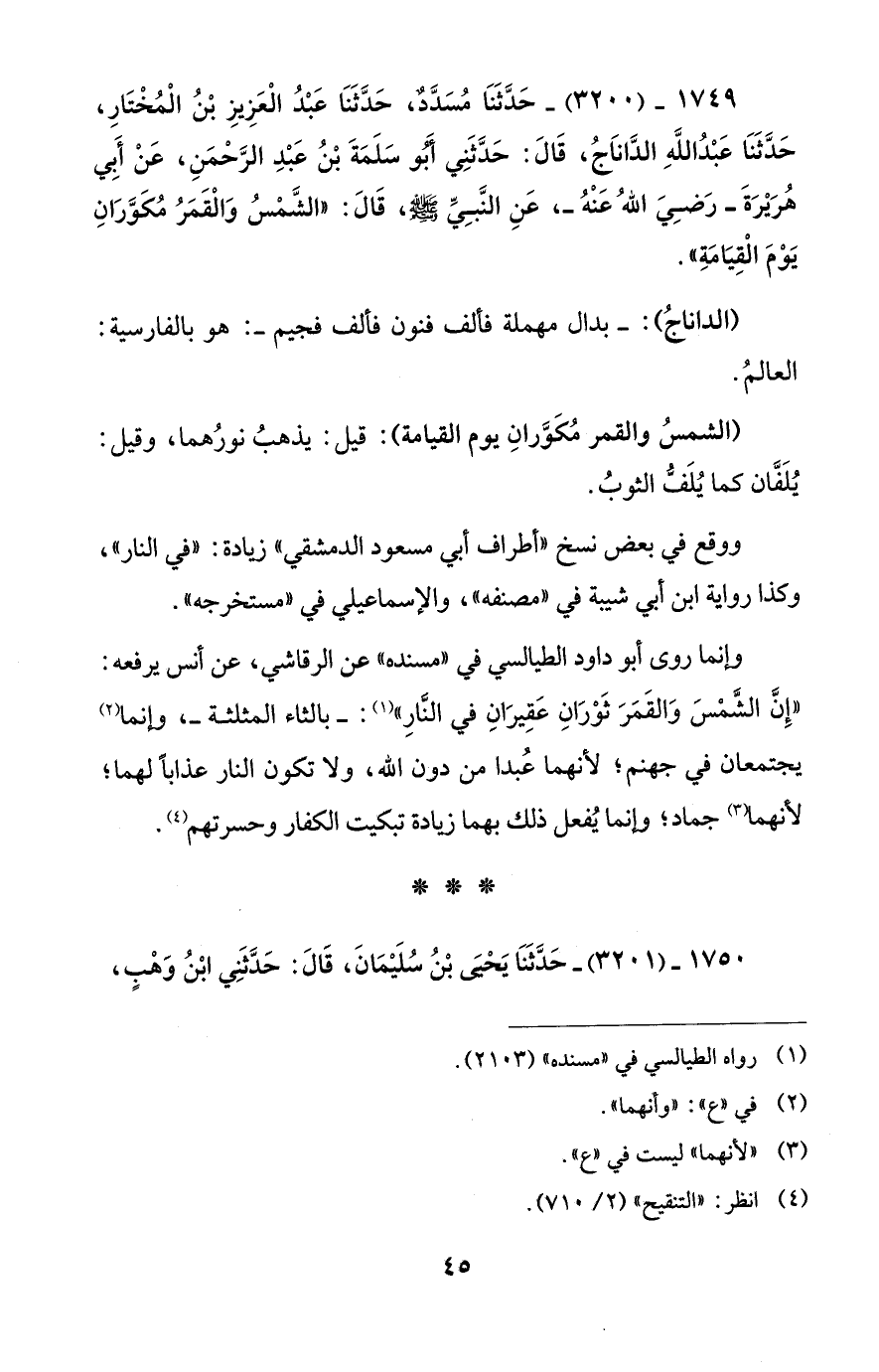 1749 - (3200) - حَدَّثَنَا مُسَدَّدٌ، حَدَّثَنَا عَبْدُ الْعَزِيزِ بْنُ الْمُخْتَارِ، حَدَّثَنَا عَبْدُ اللهِ الدَّانَاجُ، قَالَ: حَدَّثَنِي أَبُو سَلَمَةَ بْنُ عَبْدِ الرَّحْمَنِ، عَنْ أَبِي هُرَيْرَةَ -رَضِيَ اللهُ عَنْهُ-، عَنِ النَّبِيِّ - صلى الله عليه وسلم -، قَالَ: "الشَّمْسُ وَالْقَمَرُ مُكَوَّرَانِ يَوْمَ الْقِيَامَةِ".