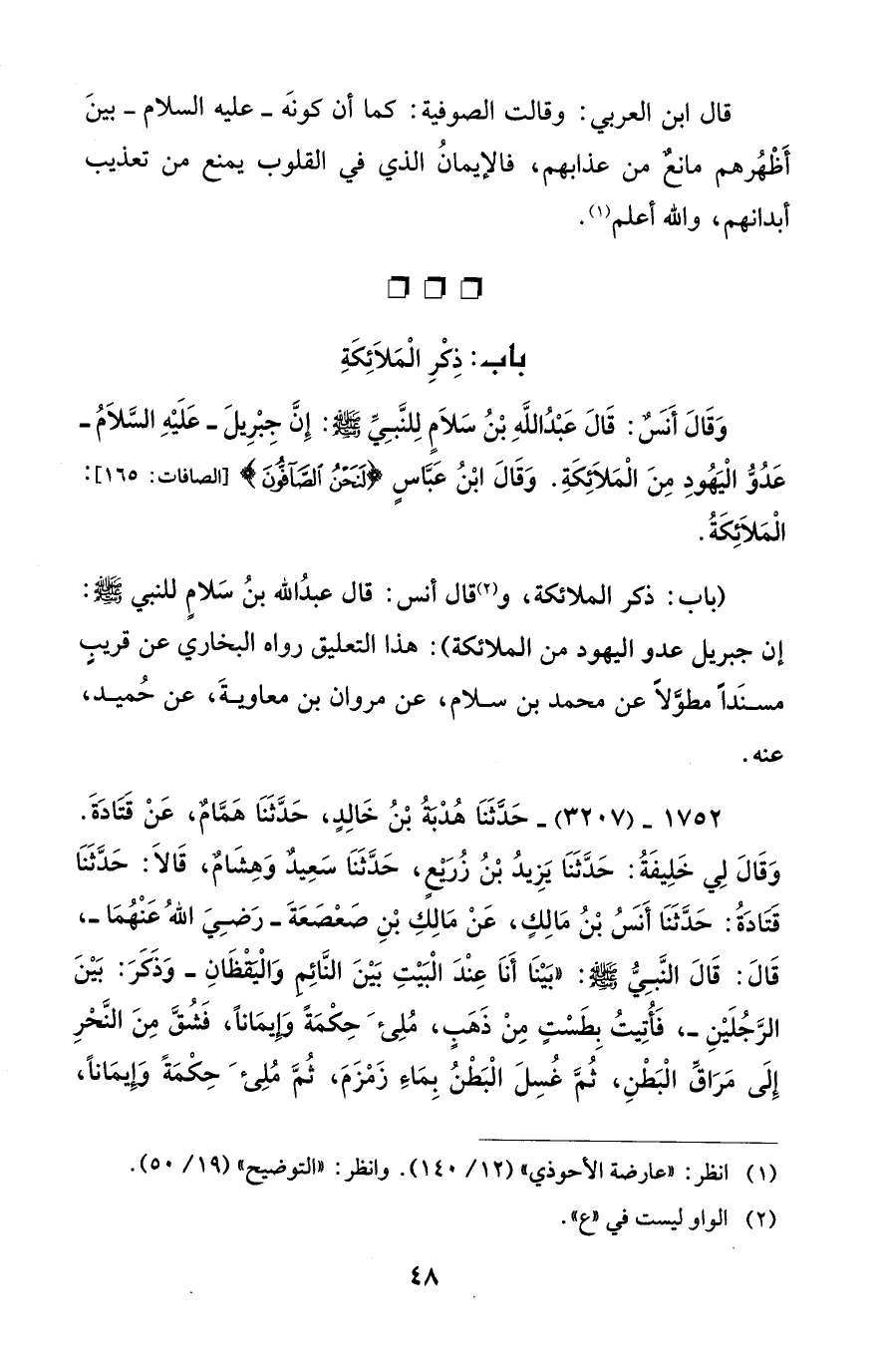 (باب: ذكر الملائكة، و (¬2) قال أنس: قال عبدُ الله بنُ سَلامٍ للنبي - صلى الله عليه وسلم -: إن جبريل عدو اليهود من الملائكة): هذا التعليق رواه البخاري عن قريبٍ مسنَداً مطوَّلاً عن محمد بن سلام، عن مروان بن معاويةَ، عن حُميد، عنه.