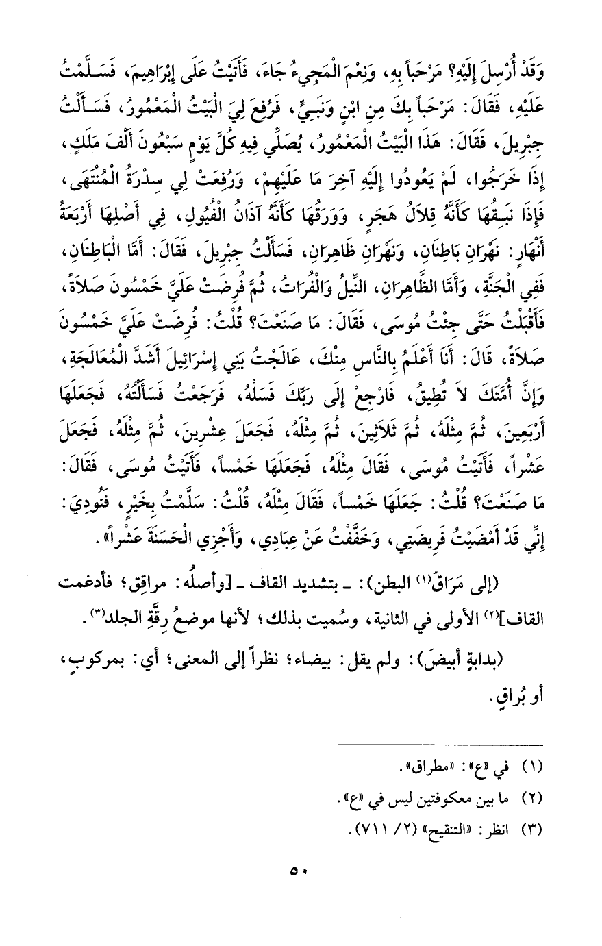 وَقَدْ أُرْسِلَ إِلَيْهِ؟ مَرْحَباً بِهِ، وَنِعْمَ الْمَجِيءُ جَاءَ، فَأَتَيْتُ عَلَى إِبْرَاهِيمَ، فَسَلَّمْتُ عَلَيْهِ، فَقَالَ: مَرْحَباً بِكَ مِنِ ابْنٍ وَنَبِيٍّ، فَرُفِعَ لِيَ الْبَيْتُ الْمَعْمُورُ، فَسَأَلْتُ جِبْرِيلَ، فَقَالَ: هَذَا الْبَيْتُ الْمَعْمُورُ، يُصَلِّي فِيهِ كُلَّ يَوْمٍ سَبْعُونَ أَلْفَ مَلَكٍ، إِذَا خَرَجُوا، لَمْ يَعُودُوا إِلَيْهِ آخِرَ مَا عَلَيْهِمْ، وَرُفِعَتْ لِي سِدْرَةُ الْمُنْتَهَى، فَإِذَا نبَقُهَا كَأَنَّهُ قِلاَلُ هَجَرٍ، وَوَرَقُهَا كَأَنَّهُ آذَانُ الْفُيُولِ، فِي أَصْلِهَا أَرْبَعَةُ أَنْهَارٍ: نَهْرَانِ بَاطِنَانِ، وَنَهْرَانِ ظَاهِرَانِ، فَسَأَلْتُ جِبْرِيلَ، فَقَالَ: أَمَّا الْبَاطِنَانِ، فَفِي الْجَنَّةِ، وَأَمَّا الظَّاهِرَانِ، النِّيلُ وَالْفُرَاتُ، ثُمَّ فُرِضَتْ عَلَيَّ خَمْسُونَ صَلاَةً، فَأَقْبَلْتُ حَتَّى جِئْتُ مُوسَى، فَقَالَ: مَا صَنَعْتَ؟ قُلْتُ: فُرِضَتْ عَلَيَّ خَمْسُونَ صَلاَةً، قَالَ: أَنَا أَعْلَمُ بِالنَّاسِ مِنْكَ، عَالَجْتُ بَنِي إِسْرَائِيلَ أَشَدَّ الْمُعَالَجَةِ، وَإِنَّ أُمَّتَكَ لاَ تُطِيقُ، فَارْجِعْ إِلَى رَبِّكَ فَسَلْهُ، فَرَجَعْتُ فَسَأَلْتُهُ، فَجَعَلَهَا أَرْبَعِينَ، ثُمَّ مِثْلَهُ، ثُمَّ ثَلاَثِينَ، ثُمَّ مِثْلَهُ، فَجَعَلَ عِشْرِينَ، ثُمَّ مِثْلَهُ، فَجَعَلَ عَشْراً، فَأَتَيْتُ مُوسَى، فَقَالَ مِثْلَهُ، فَجَعَلَهَا خَمْساً، فَأَتَيْتُ مُوسَى، فَقَالَ: مَا صَنَعْتَ؟ قُلْتُ: جَعَلَهَا خَمْساً، فَقَالَ مِثْلَهُ، قُلْتُ: سَلَّمْتُ بِخَيْرٍ، فَنُودِيَ: إِنِّي قَدْ أَمْضَيْتُ فَرِيضَتِي، وَخَفَّفْتُ عَنْ عِبَادِي، وَأَجْزِي الْحَسَنَةَ عَشْراً".