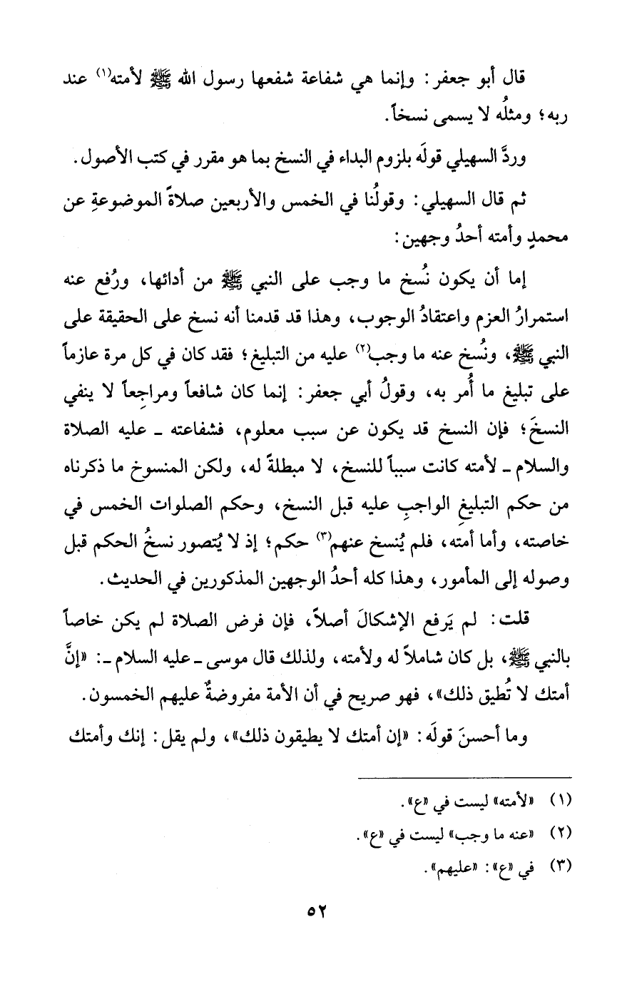 إما أن يكون نُسخ ما وجب على النبي - صلى الله عليه وسلم - من أدائها، ورُفع عنه استمرارُ العزم واعتقادُ الوجوب، وهذا قد قدمنا أنه نسخ على الحقيقة على النبي - صلى الله عليه وسلم -، ونُسخ عنه ما وجب (¬2) عليه من التبليغ؛ فقد كان في كل مرة عازماً على تبليغ ما أُمر به، وقولُ أبي جعفر: إنما كان شافعاً ومراجِعاً لا ينفي النسخَ؛ فإن النسخ قد يكون عن سبب معلوم، فشفاعته -عليه الصلاة والسلام- لأمته كانت سبباً للنسخ، لا مبطلةً له، ولكن المنسوخ ما ذكرناه من حكم التبليغِ الواجبِ عليه قبل النسخ، وحكم الصلوات الخمس في خاصته، وأما أمته، فلم يُنسخ عنهم (¬3) حكم؛ إذ لا يُتصور نسخُ الحكم قبل وصوله إلى المأمور، وهذا كله أحدُ الوجهين المذكورين في الحديث.