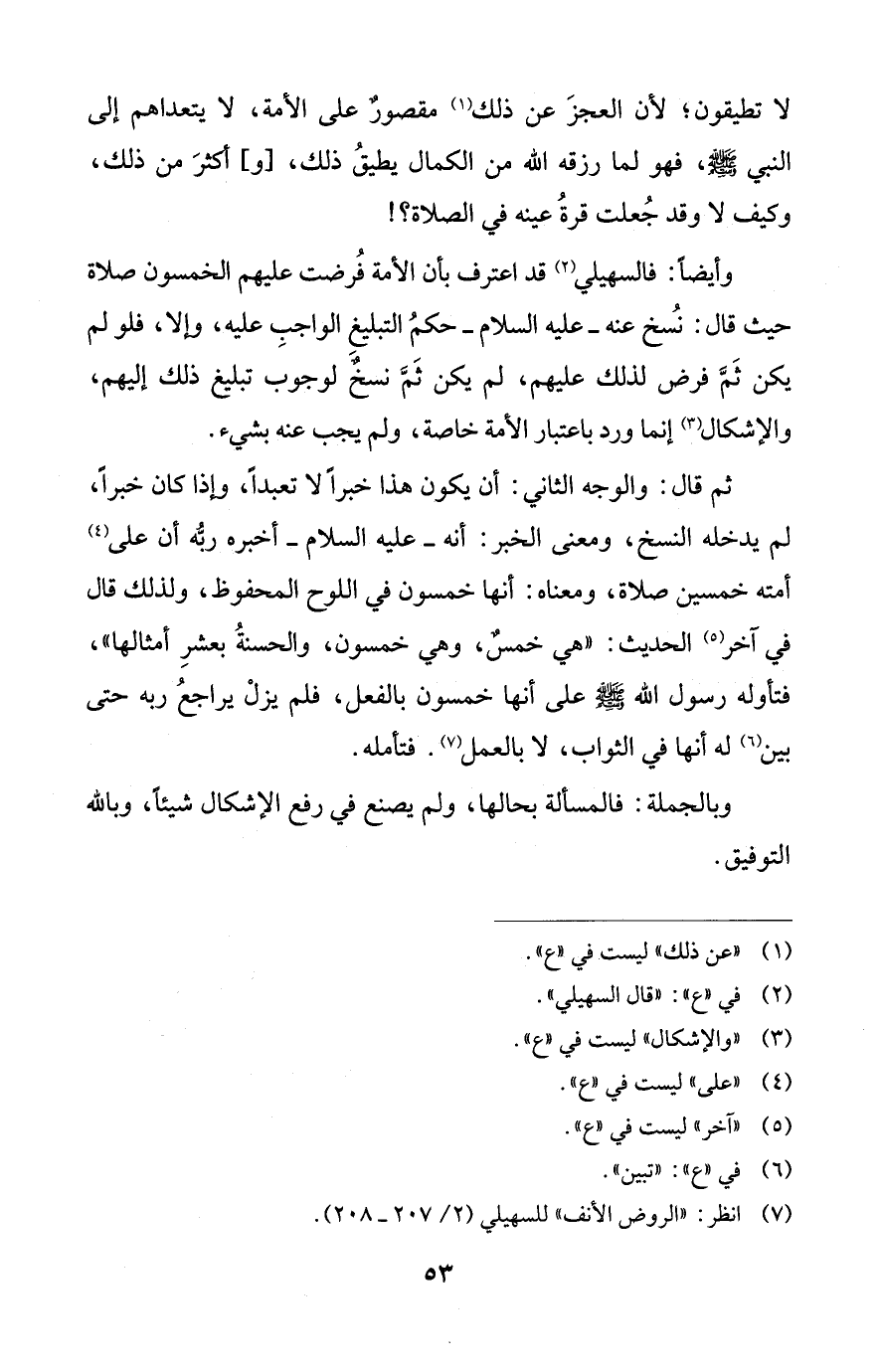 وأيضاً: فالسهيلي (¬2) قد اعترف بأن الأمة فُرضت عليهم الخمسون صلاة حيث قال: نُسخ عنه -عليه السلام- حكمُ التبليغِ الواجبِ عليه، وإلا، فلو لم يكن ثَمَّ فرض لذلك عليهم، لم يكن ثَمَّ نسخٌ لوجوب تبليغ ذلك إليهم، والإشكال (¬3) إنما ورد باعتبار الأمة خاصة، ولم يجب عنه بشيء.