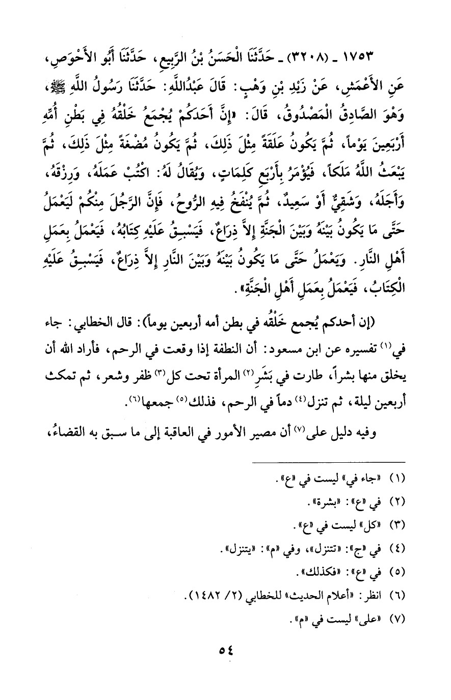 1753 - (3208) - حَدَّثَنَا الْحَسَنُ بْنُ الرَّبِيعِ، حَدَّثَنَا أَبُو الأَحْوَصِ، عَنِ الأَعْمَشِ، عَنْ زَيْدِ بْنِ وَهْبٍ: قَالَ عَبْدُ اللهِ: حَدَّثَنَا رَسُولُ اللهِ - صلى الله عليه وسلم -، وَهْوَ الصَّادِقُ الْمَصْدُوقُ، قَالَ: "إِنَّ أَحَدَكُمْ يُجْمَعُ خَلْقُهُ فِي بَطْنِ أُمِّهِ أَرْبَعِينَ يَوْماً، ثُمَّ يَكُونُ عَلَقَةً مِثْلَ ذَلِكَ، ثُمَّ يَكُونُ مُضْغَةً مِثْلَ ذَلِكَ، ثُمَّ يَبْعَثُ اللهُ مَلَكاً، فَيُؤْمَرُ بِأَرْبَعِ كَلِمَاتٍ، وَيُقَالُ لَهُ: اكْتُبْ عَمَلَهُ، وَرِزْقَهُ، وَأَجَلَهُ، وَشَقِيٌّ أَوْ سَعِيدٌ، ثُمَّ يُنْفَخُ فِيهِ الرُّوحُ، فَإِنَّ الرَّجُلَ مِنْكُمْ لَيَعْمَلُ حَتَّى مَا يَكُونُ بَيْنَهُ وَبَيْنَ الْجَنَّةِ إِلاَّ ذِرَاعٌ، فَيَسْبِقُ عَلَيْهِ كِتَابُهُ، فَيَعْمَلُ بِعَمَلِ أَهْلِ النَّارِ. وَيَعْمَلُ حَتَّى مَا يَكُونُ بَيْنَهُ وَبَيْنَ النَّارِ إِلاَّ ذِرَاعٌ، فَيَسْبِقُ عَلَيْهِ الْكِتَابُ، فَيَعْمَلُ بِعَمَلِ أَهْلِ الْجَنَّةِ".