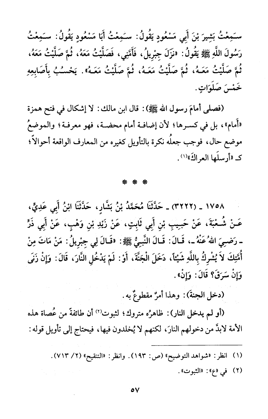 1758 - (3222) - حَدَّثَنَا مُحَمَّدُ بْنُ بَشَّارٍ، حَدَّثَنَا ابْنُ أَبِي عَدِيٍّ، عَنْ شُعْبَهَ، عَنْ حَبِيبِ بْنِ أَبِي ثَابِتٍ، عَنْ زَيْدِ بْنِ وَهْبٍ، عَنْ أَبِي ذَرٍّ -رَضِيَ اللهُ عَنْهُ-، قَالَ: قَالَ النَّبِيُّ - صلى الله عليه وسلم -: "قَالَ لِي جِبْرِيلُ: مَنْ مَاتَ مِنْ أُمَّتِكَ لا يُشْرِكُ بِاللهِ شَيْئاً، دَخَلَ الْجَنَّةَ، أَوْ: لَمْ يَدْخُلِ النَّارَ، قَالَ: وَإِنْ زَنَىَ وَإِنْ سَرَقَ؟ قَالَ: وَإِنْ".