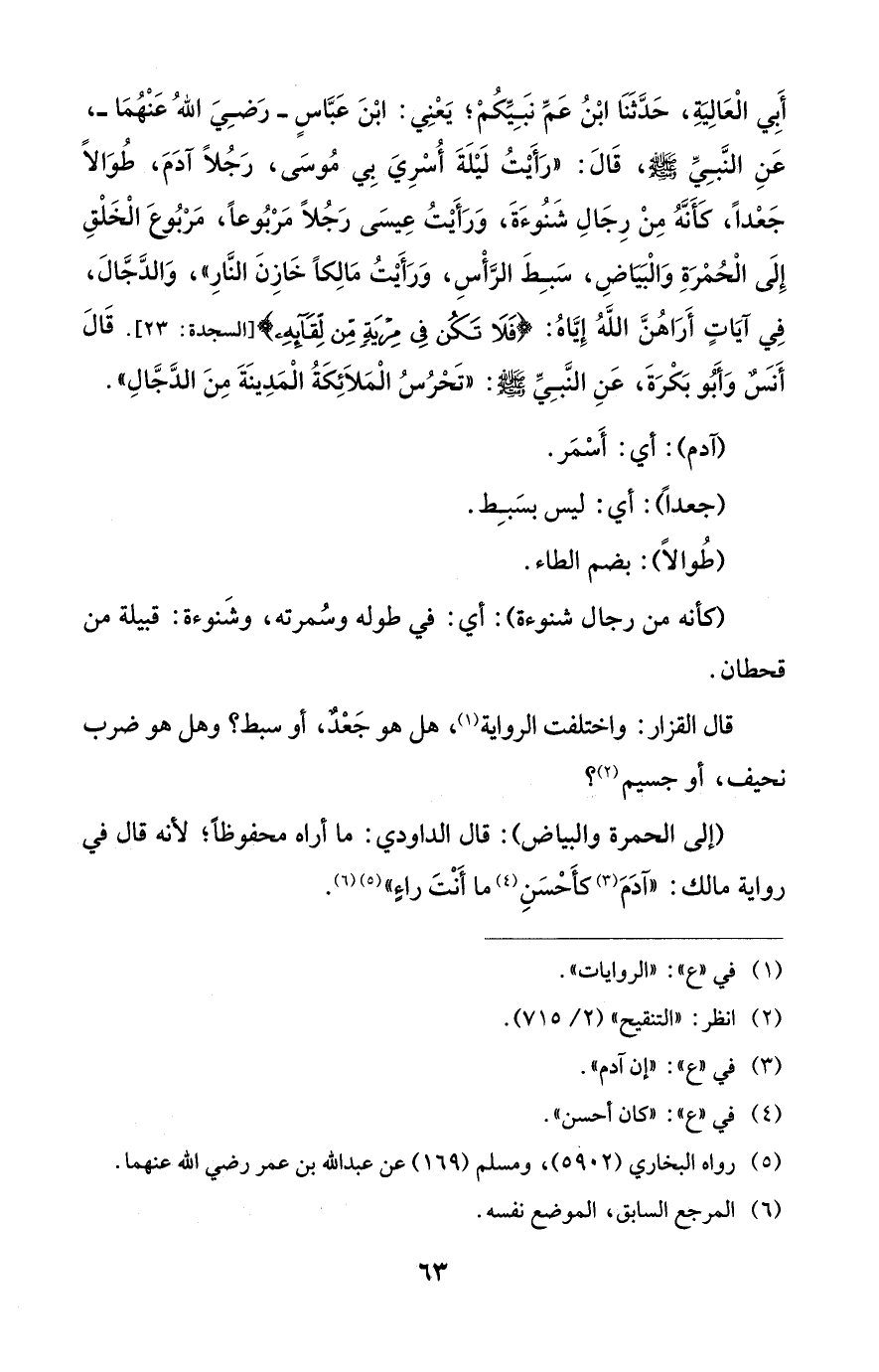 أَبِي الْعَالِيَةِ، حَدَّثَنَا ابْنُ عَمِّ نَبِيِّكُمْ؛ يَعْنِي: ابْنَ عَبَّاسٍ -رَضِيَ اللهُ عَنْهُمَا-، عَنِ النَّبِيِّ - صلى الله عليه وسلم -، قَالَ: "رَأَيْتُ لَيْلَةَ أُسْرِيَ بِي مُوسَى، رَجُلاً آدَمَ، طُوَالاً جَعْداً، كَأَنَّهُ مِنْ رِجَالِ شَنُوءَةَ، وَرَأَيْتُ عِيسَى رَجُلاً مَرْبُوعاً، مَرْبُوعَ الْخَلْقِ إِلَى الْحُمْرَةِ وَالْبَيَاضِ، سَبِطَ الرَّأْسِ، وَرَأَيْتُ مَالِكاً خَازِنَ النَّارِ"، وَالدَّجَّالَ، فِي آيَاتٍ أَرَاهُنَّ اللهُ إِيَّاهُ: {فَلَا تَكُنْ فِي مِرْيَةٍ مِنْ لِقَائِهِ} [السجدة: 23]. قَالَ أَنَسٌ وَأَبُو بَكْرَةَ، عَنِ النَّبِيِّ - صلى الله عليه وسلم -: "تَحْرُسُ الْمَلاَئِكَةُ الْمَدِينَةَ مِنَ الدَّجَّالِ".
