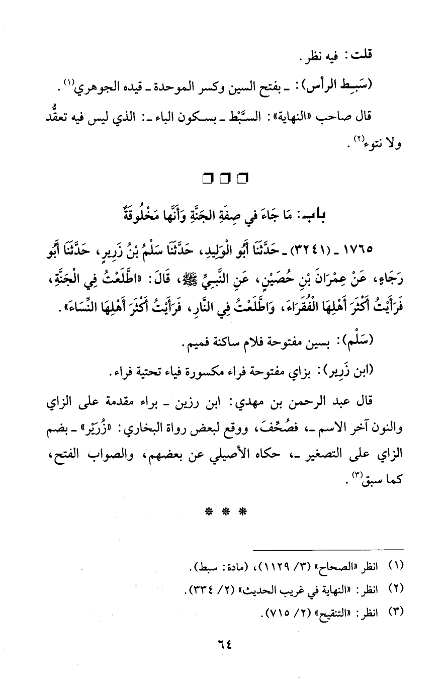 1765 - (3241) - حَدَّثَنَا أَبُو الْوَلِيدِ، حَدَّثَنَا سَلْمُ بْنُ زَرِيرٍ، حَدَّثَنَا أَبُو رَجَاءٍ، عَنْ عِمْرَانَ بْنِ حُصَيْنٍ، عَنِ النَّبِيِّ - صلى الله عليه وسلم -، قَالَ: "اطَّلَعْتُ فِي الْجَنَّةِ، فَرَأَيْتُ أَكْثَرَ أَهْلِهَا الْفُقَرَاءَ، وَاطَّلَعْتُ فِي النَّارِ، فَرَأَيْتُ أَكْثَرَ أَهْلِهَا النِّسَاءَ".