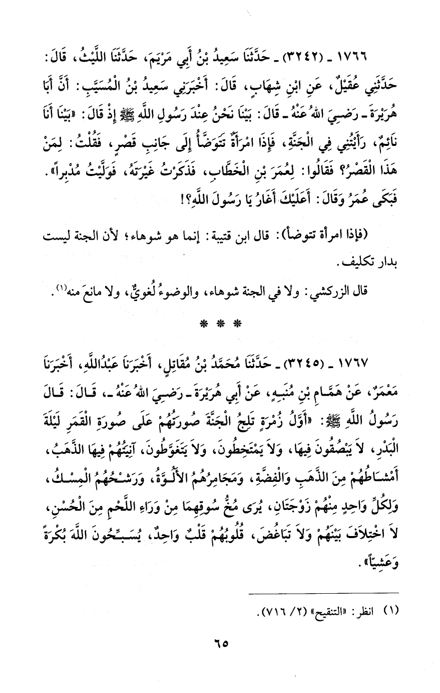 1767 - (3245) - حَدَّثَنَا مُحَمَّدُ بْنُ مُقَاتِلٍ، أَخْبَرَنَا عَبْدُ اللهِ، أَخْبَرَنَا مَعْمَرٌ، عَنْ هَمَّامِ بْنِ مُنَبِهٍ، عَنْ أَبِي هُرَيْرَةَ -رَضِيَ اللهُ عَنْهُ-، قَالَ: قَالَ رَسولُ اللهِ - صلى الله عليه وسلم -: "أَوَّلُ زُمْرَةٍ تَلِجُ الْجَنَّةَ صُورَتُهُمْ عَلَى صُورَةِ الْقَمَرِ لَيْلَةَ الْبَدْرِ، لا يَبْصُقُونَ فِيهَا، وَلاَ يَمْتَخِطُونَ، وَلاَ يَتَغَوَّطُونَ، آنِيَتُهُمْ فِيهَا الذَّهَبُ، أَمْشَاطُهُمْ مِنَ الذَّهَبِ وَالْفِضَّةِ، وَمَجَامِرُهُمُ الأَلُوَّةُ، وَرَشْحُهُمُ الْمِسْكُ، وَلِكُلِّ وَاحِدٍ مِنْهُمْ زَوْجَتَانِ، يُرَى مُخُّ سُوقهِمَا مِنْ وَرَاءَ اللَّحْم مِنَ الْحُسْنِ، لا اخْتِلاَفَ بَيْنَهُمْ وَلاَ تَبَاغُضَ، قُلُوبُهُمْ قَلْبٌ وَاحِدٌ، يُسَبِّحُونَ الله بُكْرَةً وَعَشِيّاً".