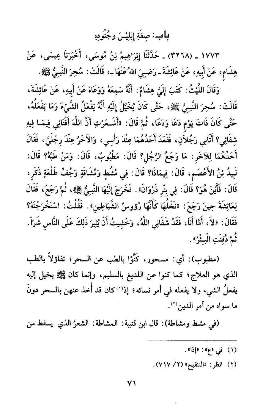 1773 - (3268) - حَدَّثَنَا إِبْرَاهِيمُ بْنُ مُوسَى، أَخْبَرَناَ عِيسَى، عَنْ هِشَامٍ، عَنْ أَبِيهِ، عَنْ عَائِشَةَ -رَضِيَ اللهُ عَنْهَا-، قَالَتْ: سُحِرَ النَّبِيُّ - صلى الله عليه وسلم -.