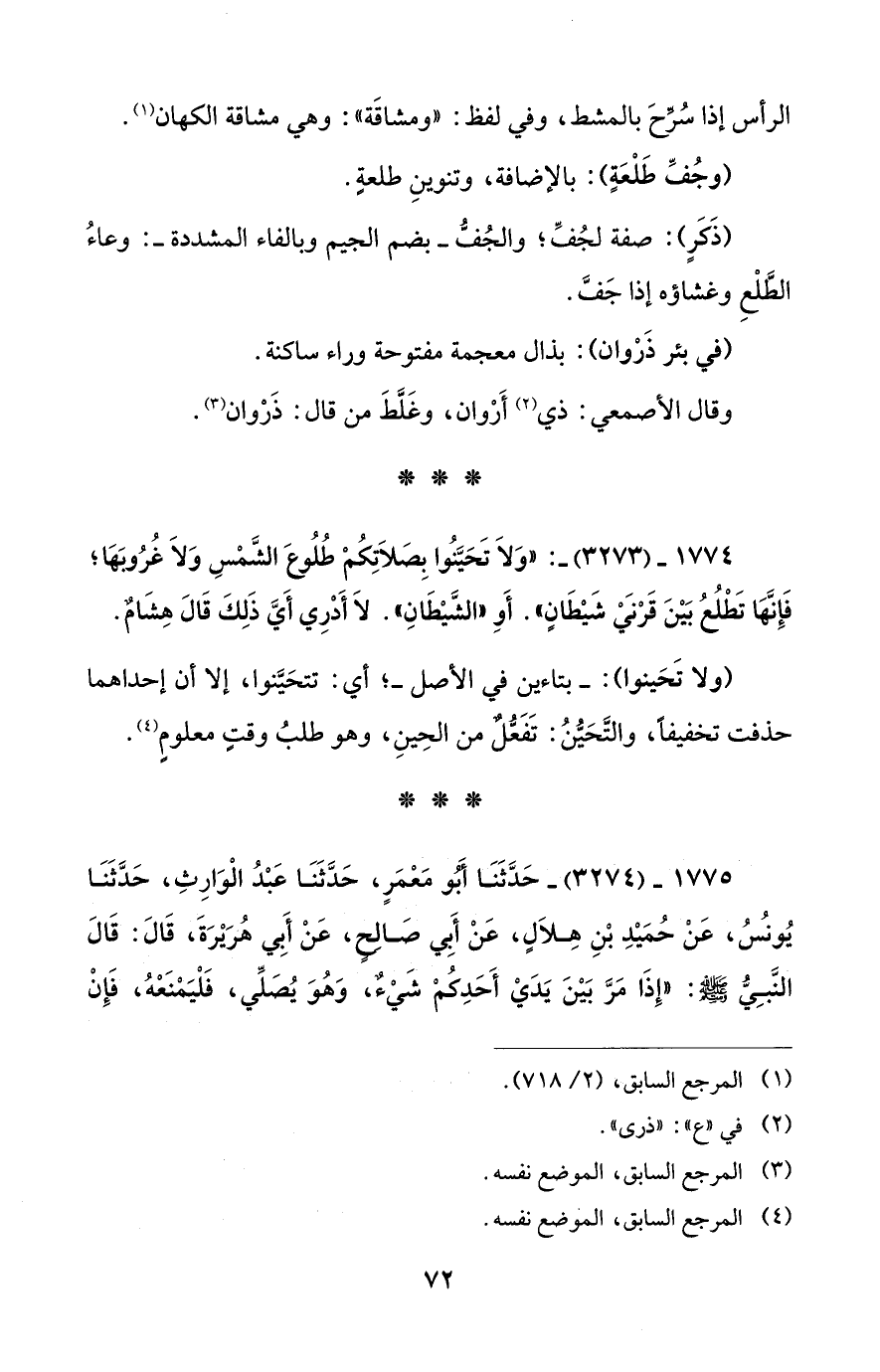 1774 - (3273) -: "وَلاَ تَحَيَّنُوا بِصَلاَتِكُمْ طُلُوعَ الشَّمْسِ وَلاَ غُرُوبَهَا؛ فَإِنَّهَا تَطْلُعُ بَيْنَ قَرْنَيْ شَيْطَانٍ". أَوِ "الشَيْطَانِ". لاَ أَدْرِي أَيَّ ذَلِكَ قَالَ هِشَامٌ.