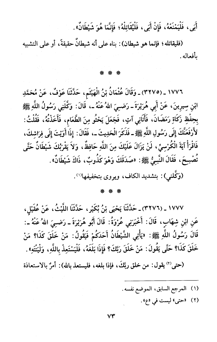 1776 - (3275) - وَقَالَ عُثْمَانُ بْنُ الْهَيْثَمِ، حَدَّثَنَا عَوْفٌ، عَنْ مُحَمَّدِ ابْنِ سِيرِينَ، عَنْ أَبِي هُرَيْرَةَ -رَضِيَ اللهُ عَنْهُ-، قَالَ: وَكَّلَنِي رَسُولُ اللهِ - صلى الله عليه وسلم - بِحِفْظِ زَكَاةِ رَمَضَانَ، فَأَتَانِي آتٍ، فَجَعَلَ يَحْثُو مِنَ الطَّعَامِ، فَأَخَذْتُهُ، فَقُلْتُ: لأَرْفَعَنَّكَ إِلَى رَسُولِ اللهِ - صلى الله عليه وسلم -فَذَكرَ الْحَدِيثَ-، فَقَالَ: إِذَا أَوَيْتَ إِلَى فِرَاشِكَ، فَاقْرَأْ آيَةَ الْكُرْسِيِّ، لَنْ يَزَالَ عَلَيْكَ مِنَ اللهِ حَافِظٌ، وَلاَ يَقْرَبُكَ شَيْطَانٌ حَتَّى تُصْبحَ، فَقَالَ النَّبِيُّ - صلى الله عليه وسلم -: "صَدَقَكَ وَهْوَ كَذُوبٌ، ذَاكَ شَيْطَانٌ".
