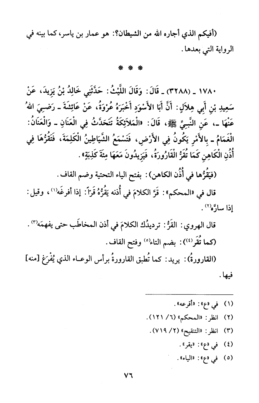 1780 - (3288) - قَالَ: وَقَالَ اللَّيْثُ: حَدَّثَنِي خَالِدُ بْنُ يَزِيدَ، عَنْ سَعِيدِ بْنِ أَبِي هِلاَلٍ: أَنَّ أَبَا الأَسْوَدِ أَخْبَرَهُ عُرْوَةُ، عَنْ عَائِشَةَ -رَضِيَ اللهُ عَنْهَا-، عَنِ النَّبِيِّ - صلى الله عليه وسلم -، قَالَ: "الْمَلاَئِكَةُ تَتَحَدَّثُ فِي الْعَنَانِ -وَالْعَنَانُ: الْغَمَامُ- بِالأَمْرِ يَكُونُ فِي الأَرْضِ، فَتَسْمَعُ الشَّيَاطِينُ الْكَلِمَةَ، فَتَقُرُّهَا فِي أُذُنِ الْكَاهِنِ كَمَا تُقَرُّ الْقَارُورَةُ، فَيَزِيدُونَ مَعَهَا مِئَةَ كَذِبَةٍ".