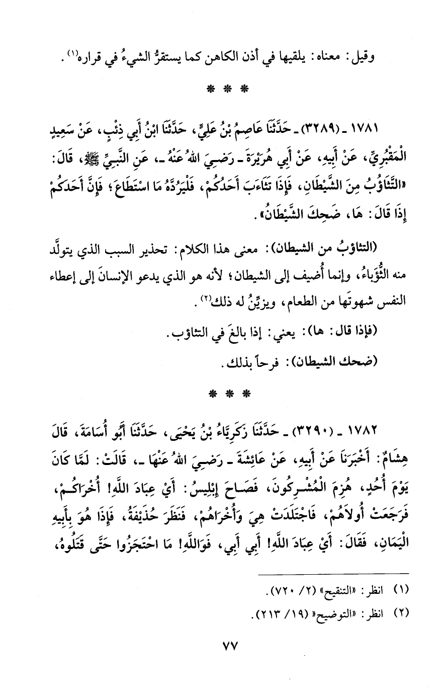 1781 - (3289) - حَدَّثَنَا عَاصِمُ بْنُ عَلِيٍّ، حَدَّثَنَا ابْنُ أَبِي ذِئْبٍ، عَنْ سَعِيدٍ الْمَقْبُرِيِّ، عَنْ أَبِيهِ، عَنْ أَبِي هُرَيْرَةَ -رَضِيَ اللهُ عَنْهُ-، عَنِ النَّبِيِّ - صلى الله عليه وسلم -، قَالَ: "التَّثَاؤُبُ مِنَ الشَّيْطَانِ، فَإذَا تَثَاءَبَ أَحَدُكُمْ، فَلْيَرُدَّهُ مَا اسْتَطَاعَ؛ فَإِنَّ أَحَدَكُمْ إِذَا قَالَ: هَا، ضَحِكَ الشَّيْطَانُ".