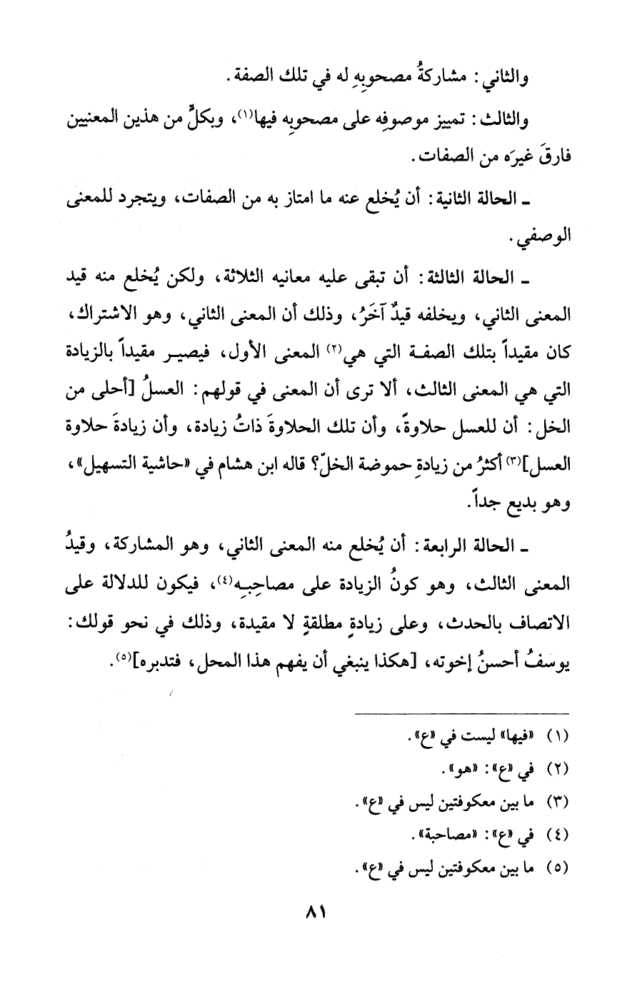 - الحالة الرابعة: أن يُخلع منه المعنى الثاني، وهو المشاركة، وقيدُ المعنى الثالث، وهو كونُ الزيادة على مصاحِبِه (¬4)، فيكون للدلالة على الاتصاف بالحدث، وعلى زيادةٍ مطلقةٍ لا مقيدة، وذلك في نحو قولك: يوسفُ أحسنُ إخوته، [هكذا ينبغي أن يفهم هذا المحل، فتدبره] (¬5).