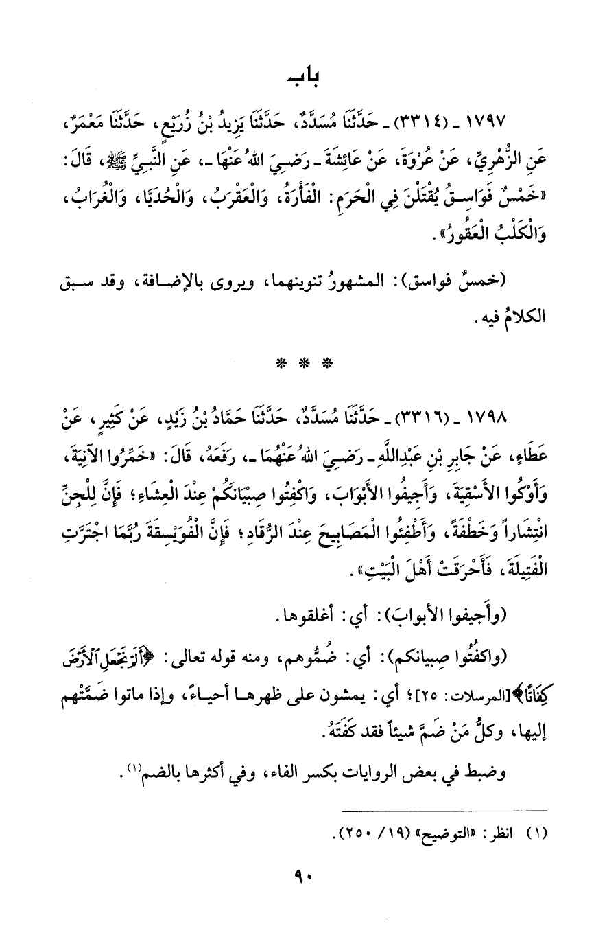 1798 - (3316) - حَدَّثَنَا مُسَدَّدٌ، حَدَّثَنَا حَمَّادُ بْنُ زَيْدٍ، عَنْ كَثِيرٍ، عَنْ عَطَاءٍ، عَنْ جَابِرِ بْنِ عَبْدِ اللهِ -رَضِيَ اللهُ عَنْهُمَا-، رَفَعَهُ، قَالَ: "خَمِّرُوا الآنِيَةَ، وَأَوْكُوا الأَسْقِيَةَ، وَأَجِيفُوا الأَبْوَابَ، وَاكْفِتُوا صِبْيَانَكُمْ عِنْدَ الْعِشَاءَ؛ فَإِنَّ لِلْجِنِّ انْتِشَاراً وَخَطْفَةً، وَأَطْفِئُوا الْمَصَابِيحَ عِنْدَ الرُّقَادِ؛ فَإِنَّ الْفُوَيْسِقَةَ رُبَّمَا اجْتَرَّتِ الْفَتِيلَةَ، فَأَحْرَقَتْ أَهْلَ الْبَيْتِ".
