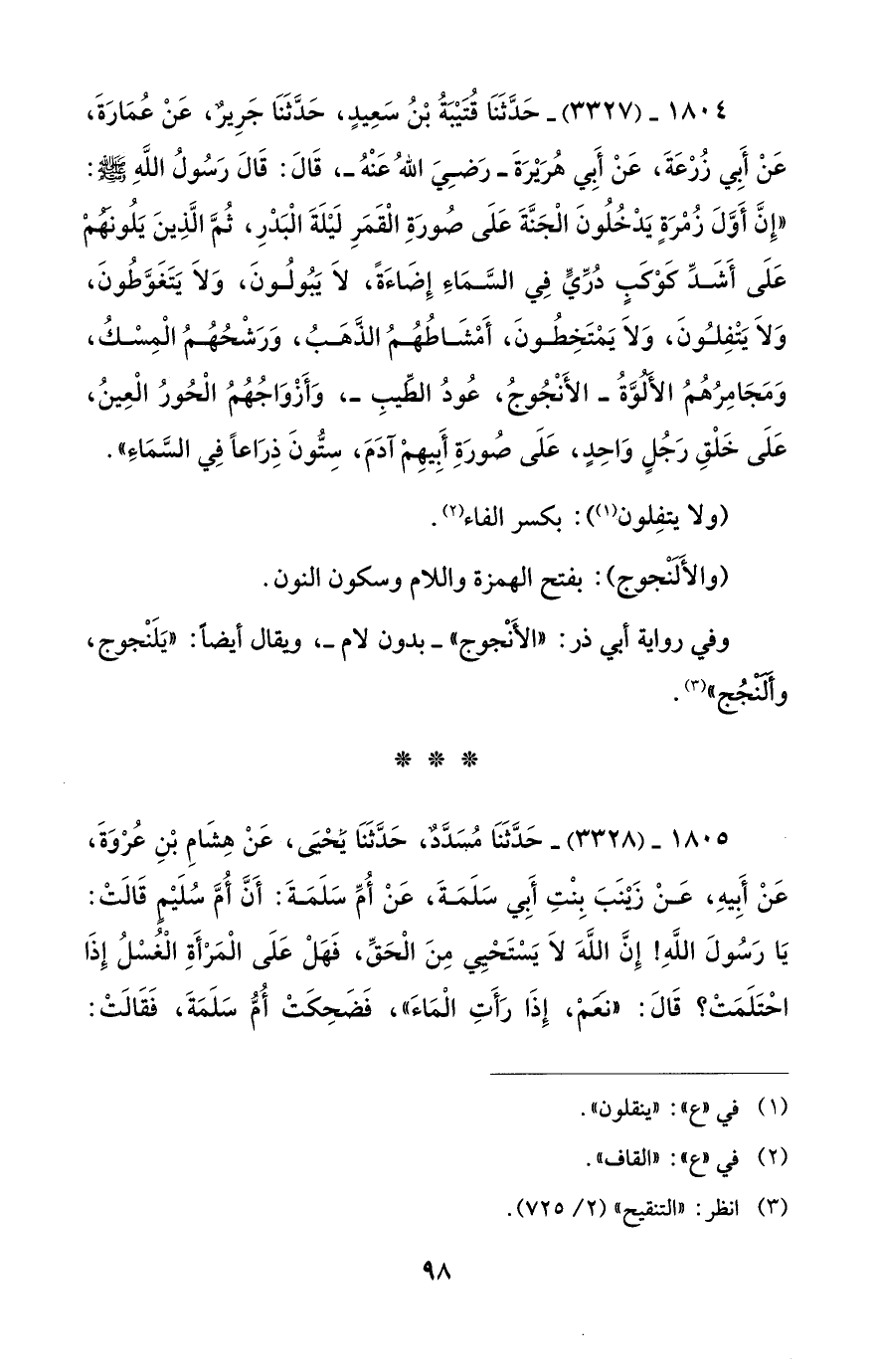 1804 - (3327) - حَدَّثَنَا قُتَيْبَةُ بْنُ سَعِيدٍ، حَدَّثَنَا جَرِيرٌ، عَنْ عُمَارَةَ، عَنْ أَبِي زُرْعَةَ، عَنْ أَبِي هُرَيْرَةَ -رَضِيَ اللهُ عَنْهُ-، قَالَ: قَالَ رَسُولُ اللهِ - صلى الله عليه وسلم -: "إِنَّ أَوَّلَ زُمرَةٍ يَدْخُلُونَ الْجَنَّةَ عَلَى صُورَةِ الْقَمَرِ لَيْلَةَ الْبَدْرِ، ثُمَّ الَّذِينَ يَلُونَهُمْ عَلَى أَشَدِّ كَوْكَبٍ دُرِّيٍّ فِي السَّمَاءِ إِضَاءَةً، لاَ يَيُولُونَ، وَلاَ يَتَغَوَّطُونَ، وَلاَ يَتْفِلُونَ، وَلاَ يَمْتَخِطُونَ، أَمْشَاطُهُمُ الذَّهَبُ، وَرَشْحُهُمُ الْمِسْكُ، وَمَجَامِرُهُمُ الأَلُوَّةُ -الأَنْجُوجُ، عُودُ الطِّيبِ-، وَأَزْوَاجُهُمُ الْحُورُ الْعِينُ، عَلَى خَلْقِ رَجُلٍ وَاحِدٍ، عَلَى صُورَةِ أَبِيهِمْ آدَمَ، سِتُّونَ ذِرَاعاً فِي السَّمَاءِ".