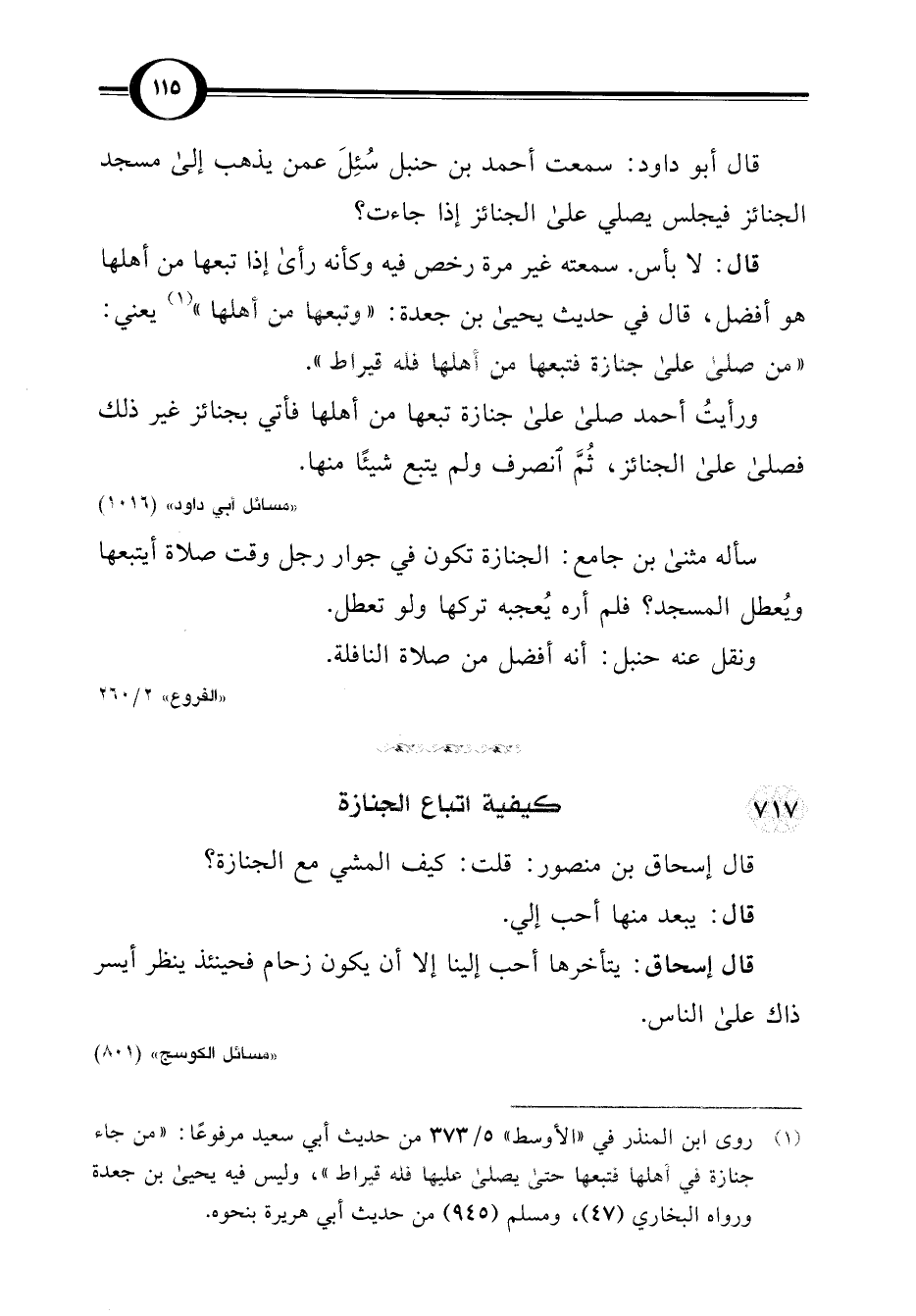 ورأيتُ أحمد صلى على جنازة تبعها من أهلها فأتي بجنائز غير ذلك فصلى على الجنائز، ثُمَّ انصرف ولم يتبع شيئًا منها.