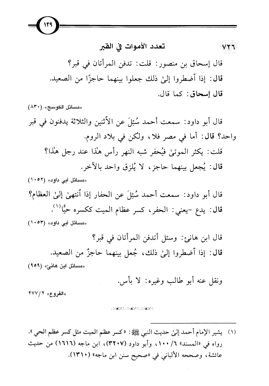 (¬1) يشير الإمام أحمد إلى حديث النبي -صلى اللَّه عليه وسلم-: "كسر عظم الميت مثل كسر عظم الحي". رواه في "المسند" 6/ 100، وأبو داود (3207)، ابن ماجه (1616) من حديث عائشة، وصححه الألباني في "صحيح سنن ابن ماجه" (1310).