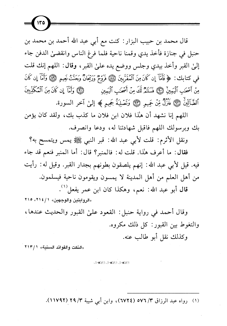قال محمد بن حبيب البزار: كنت مع أبي عبد اللَّه أحمد بن محمد بن حنبل في جنازة فأخذ يدي وقمنا ناحية فلما فرغ الناس وانقضى الدفن جاء إلى القبر وأخذ بيدي وجلس ووضع يده على القبر، وقال: اللهم إنك قلت في كتابك: {فَأَمَّا إِنْ كَانَ مِنَ الْمُقَرَّبِينَ (88) فَرَوْحٌ وَرَيْحَانٌ وَجَنَّتُ نَعِيمٍ (89) وَأَمَّا إِنْ كَانَ مِنْ أَصْحَابِ الْيَمِينِ (90) فَسَلَامٌ لَكَ مِنْ أَصْحَابِ الْيَمِينِ (91) وَأَمَّا إِنْ كَانَ مِنَ الْمُكَذِّبِينَ الضَّالِّينَ (92) فَنُزُلٌ مِنْ حَمِيمٍ (93) وَتَصْلِيَةُ جَحِيمٍ (94)} إلى آخر السورة.