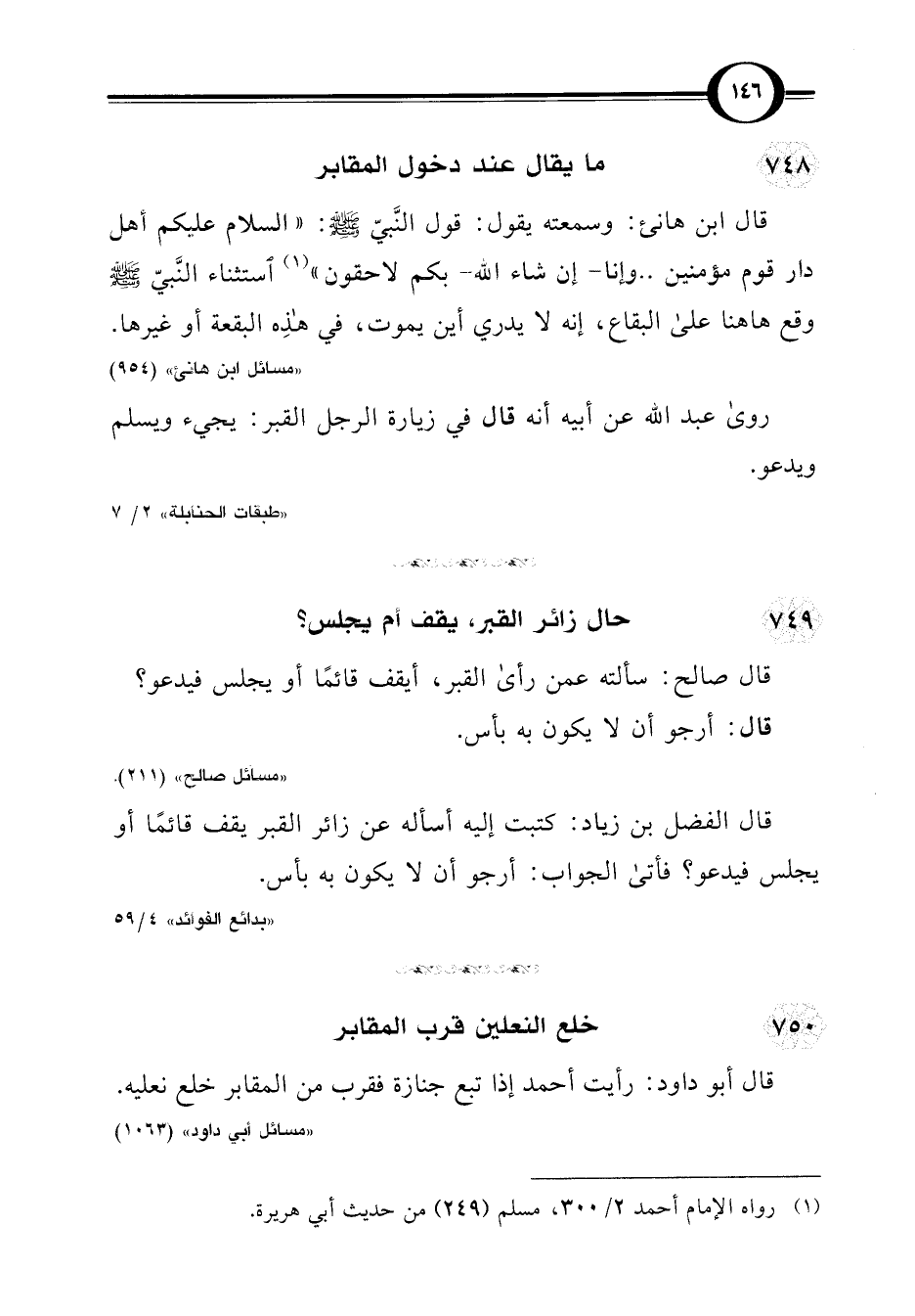 قال ابن هانئ: وسمعته يقول: قول النَّبيّ -صلى اللَّه عليه وسلم-: "السلام عليكم أهل دار قوم مؤمنين .. وإنا -إن شاء اللَّه- بكم لاحقون" (¬1) استثناء النَّبيّ -صلى اللَّه عليه وسلم- وقع هاهنا على البقاع، إنه لا يدري أين يموت، في هذِه البقعة أو غيرها.